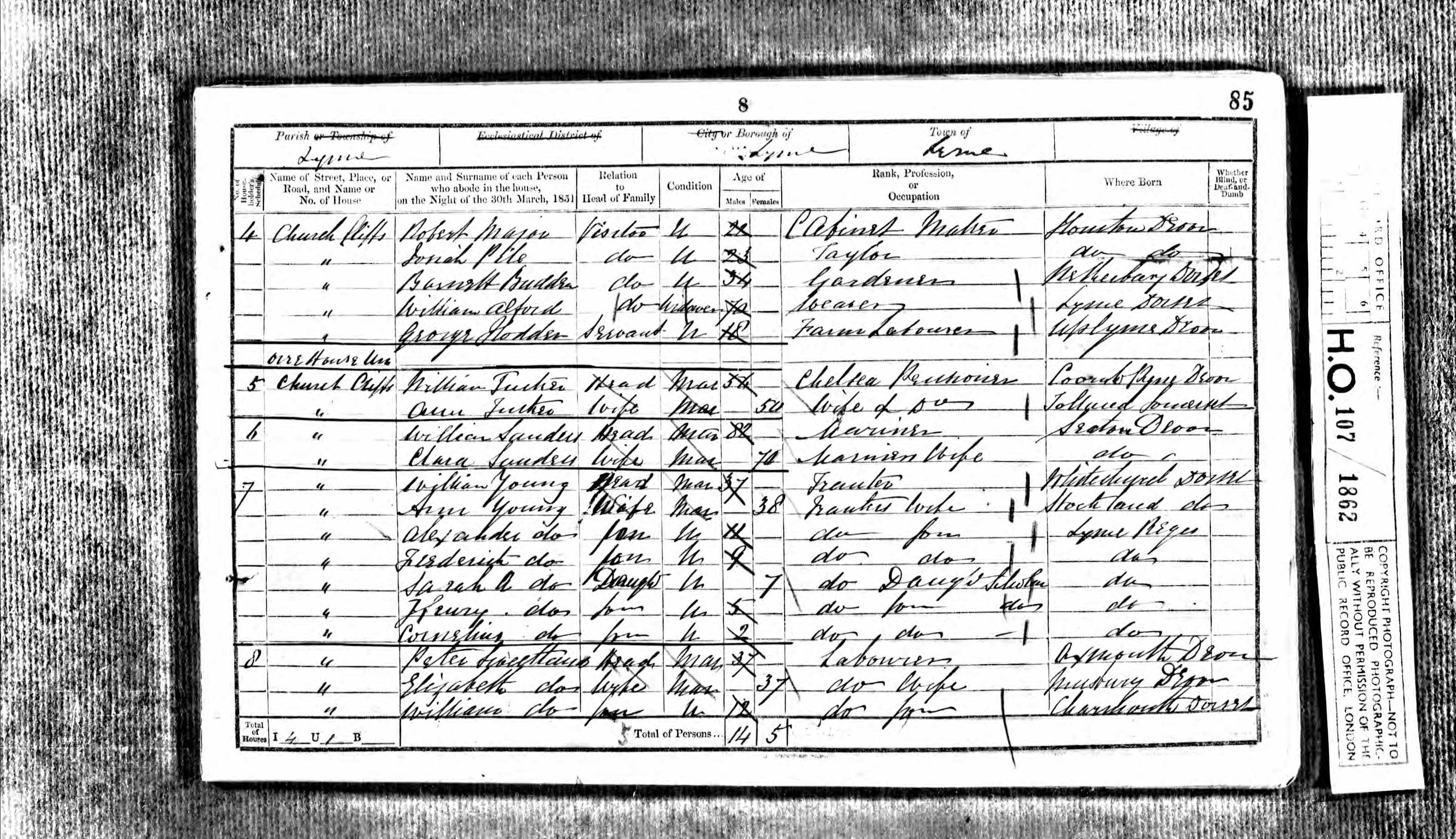 - was recorded in the census on 30 Mar, 1851 at Church Cliffs, Lyme Regis, Dorset, England