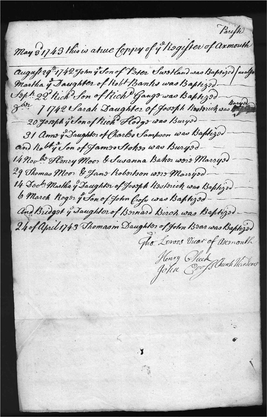 - John Swetland was baptised on 29 Aug, 1742 at St. Michael's Church, Axmouth, Devon, England