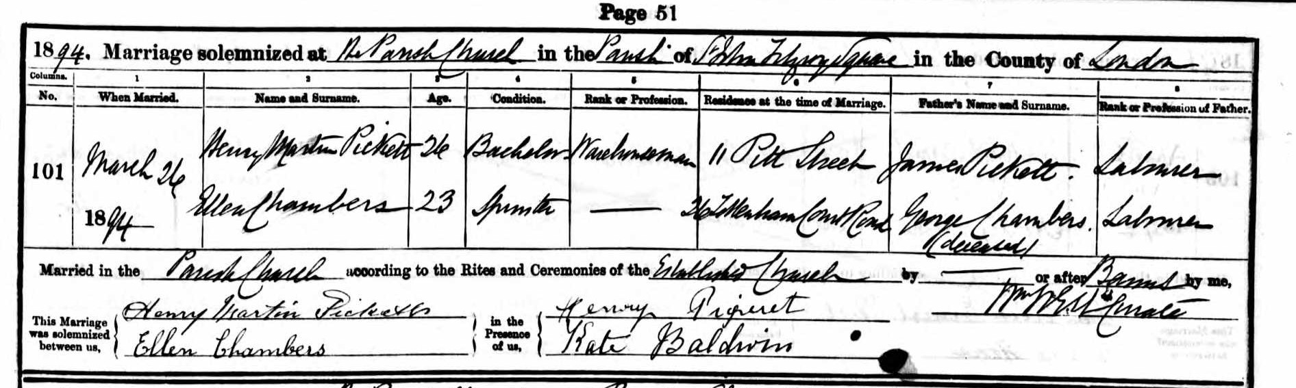 Parish Registers of St John the Evangelist, Charlotte Street, London; Marriage entry for Henry Martin Pickett and Ellen Chambers, 26 Mar 1894, Page 51, No 101.