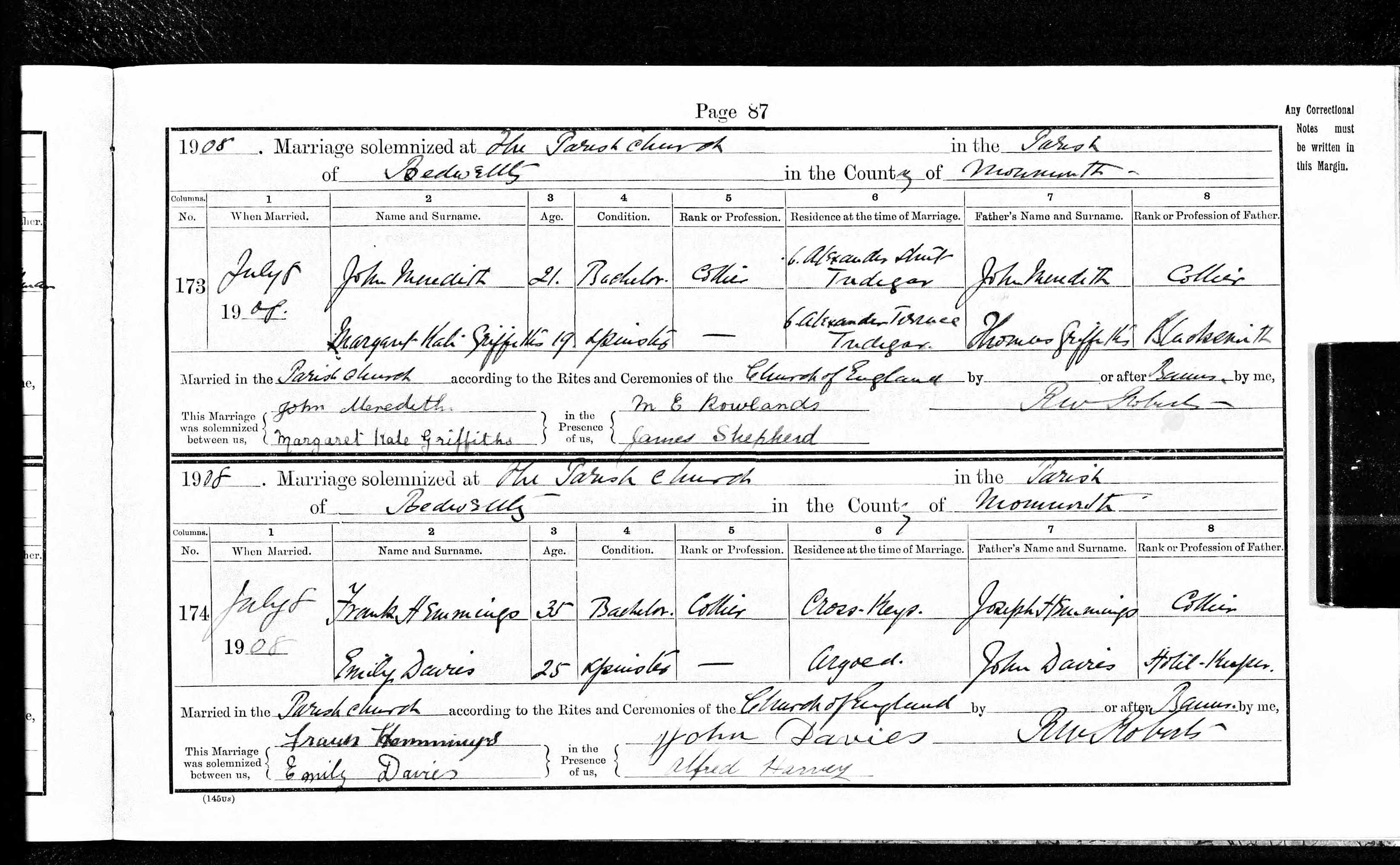 Parish Registers of St Sannan, Bedwelty, Monmouthshiire; Marriage entry for Frank Hemmings and Emily Davies, 8 Jul 1908, Page 87, No 174.