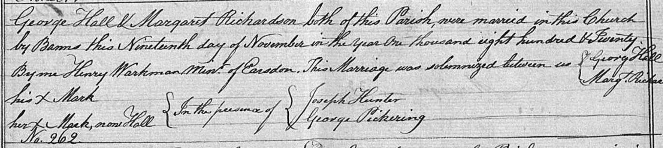 Bishop's Transcripts for the Diocese of Durham, England; Marriage entry for George Hall and Margaret Richardson, Earsdon, 19 Nov 1820, No 262.