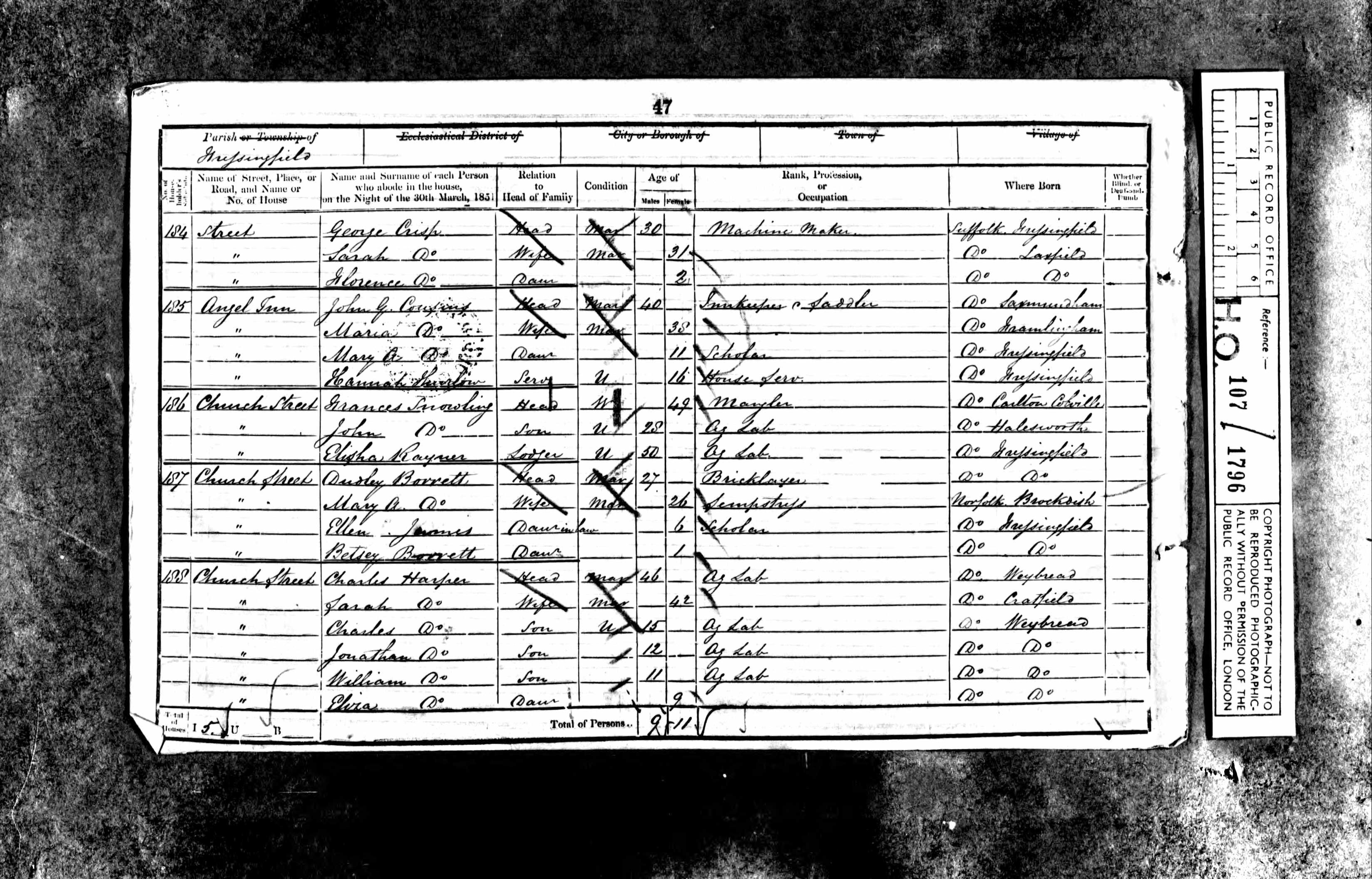 1851 England and Wales Census; Class HO107, Piece 1796, Folio 278, Page 47, Schedule 186.