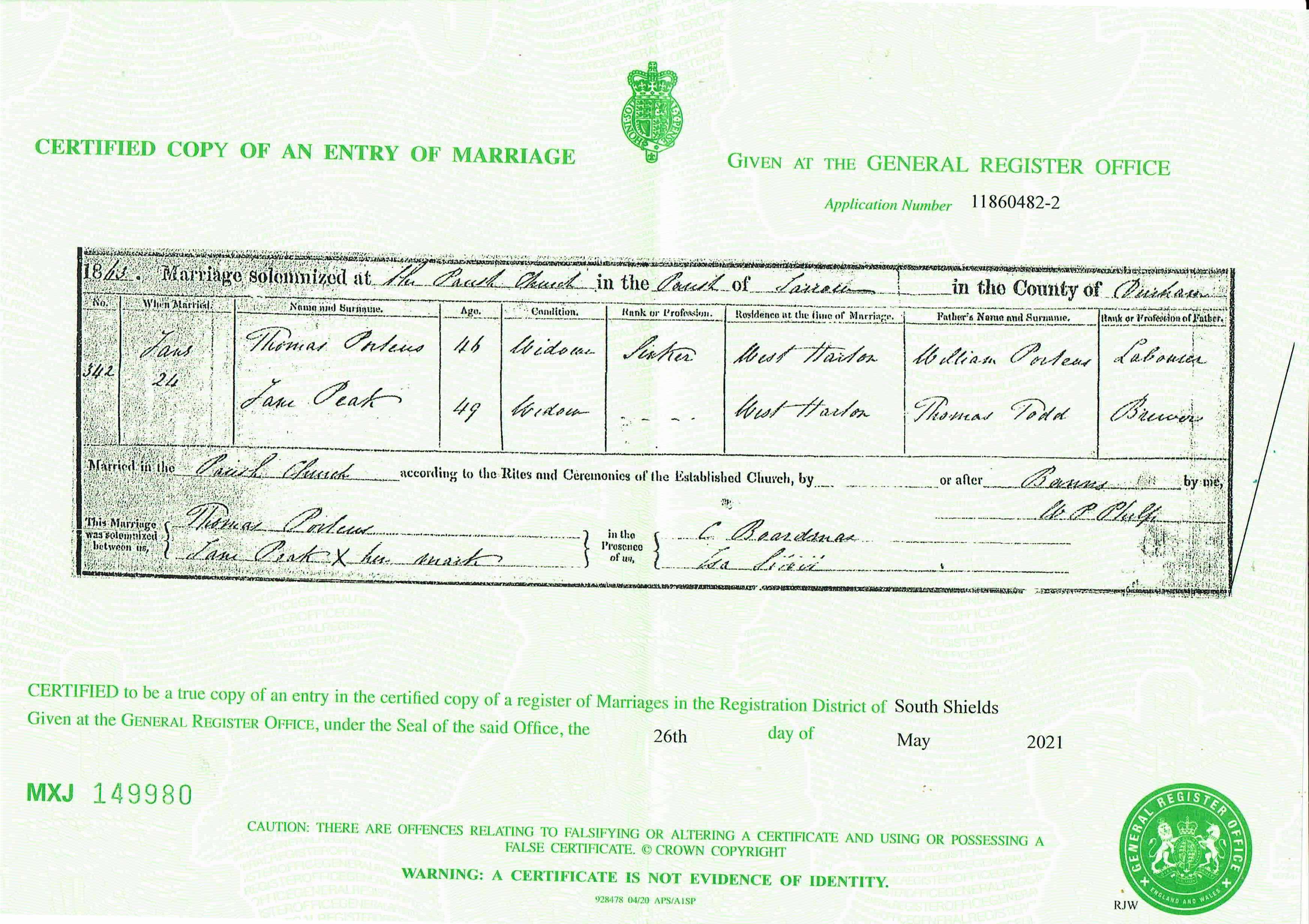 Marriage at The Parish Church in the Registration District of South Shields, district of Parish of Jarrow, Durham, 1863, no. 342. Married 24 Jan 1863; Thomas Porteus, age 46, condition Widower, occupation Sinker, residence West Harton and Jane Peak, age 49, condition Widow, residence West Harton; groom's father William Porteus, Labourer; bride's father Thomas Todd, Brewer; married by Banns according to the rites of the Established Church; groom signed name, bride could not sign name; witnesses C Boardman (signed), [Ira Lickit] (signed)