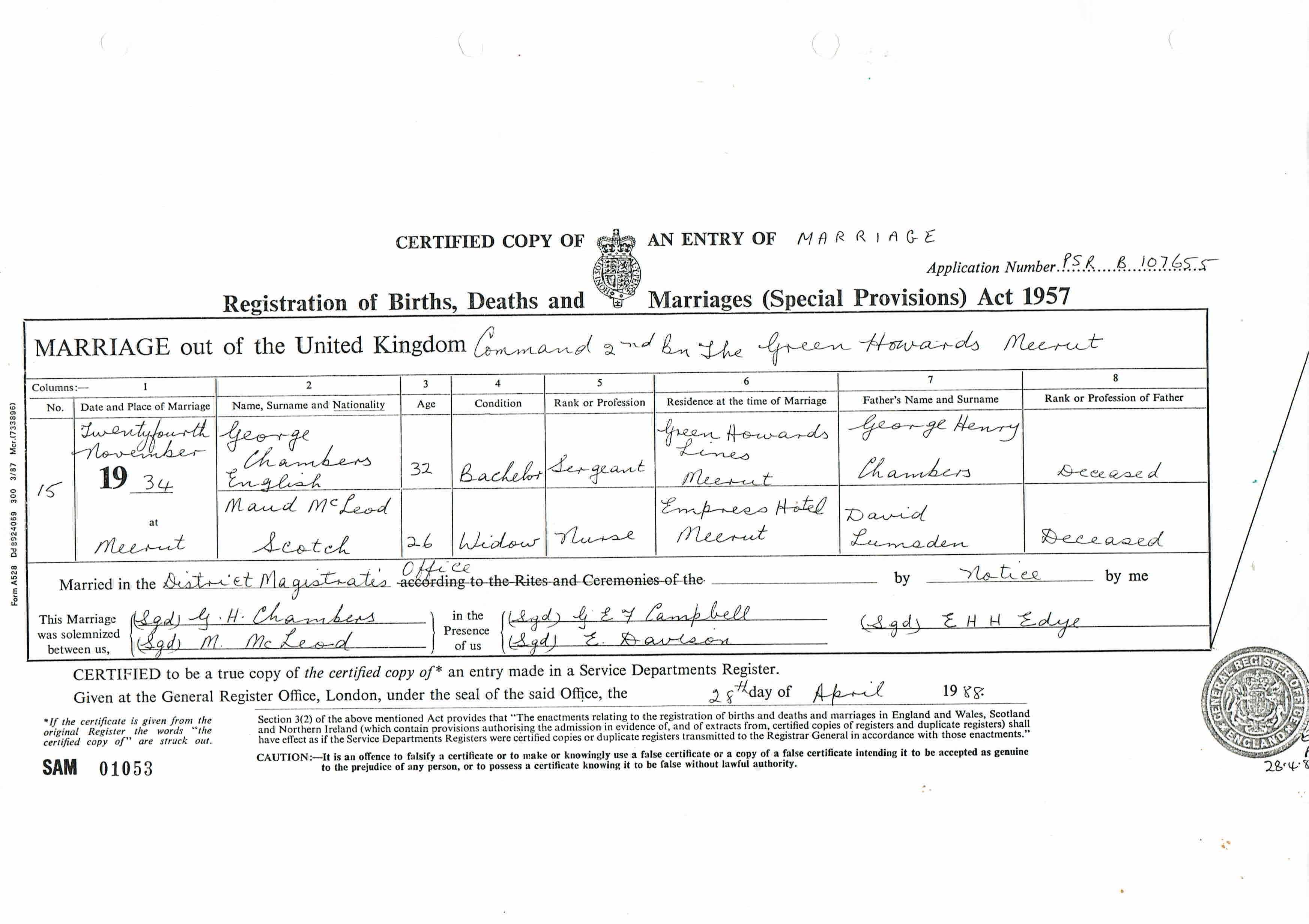 Marriage at Command 2nd Bn The Green Howards Meerut in the Registration District of Meerut, India, 1934, no. 15. Married 24 Nov 1934; George Chambers, English, age 32, condition Bachelor, occupation Sergeant, residence Green Howards Lines, Meerut and Maud McLeod, Scotch, age 26, condition Widow, occupation Nurse, residence Empress Hotel, Meerut; groom's father George Henry Chambers, Deceased; bride's father David Lumsden, Deceased; married by notice; groom signed name, bride signed name; witnesses G. E. F. Campbell (signed), E. Davison (signed), occupation GRO Index Army Marriages ARM2, page 117, line 35