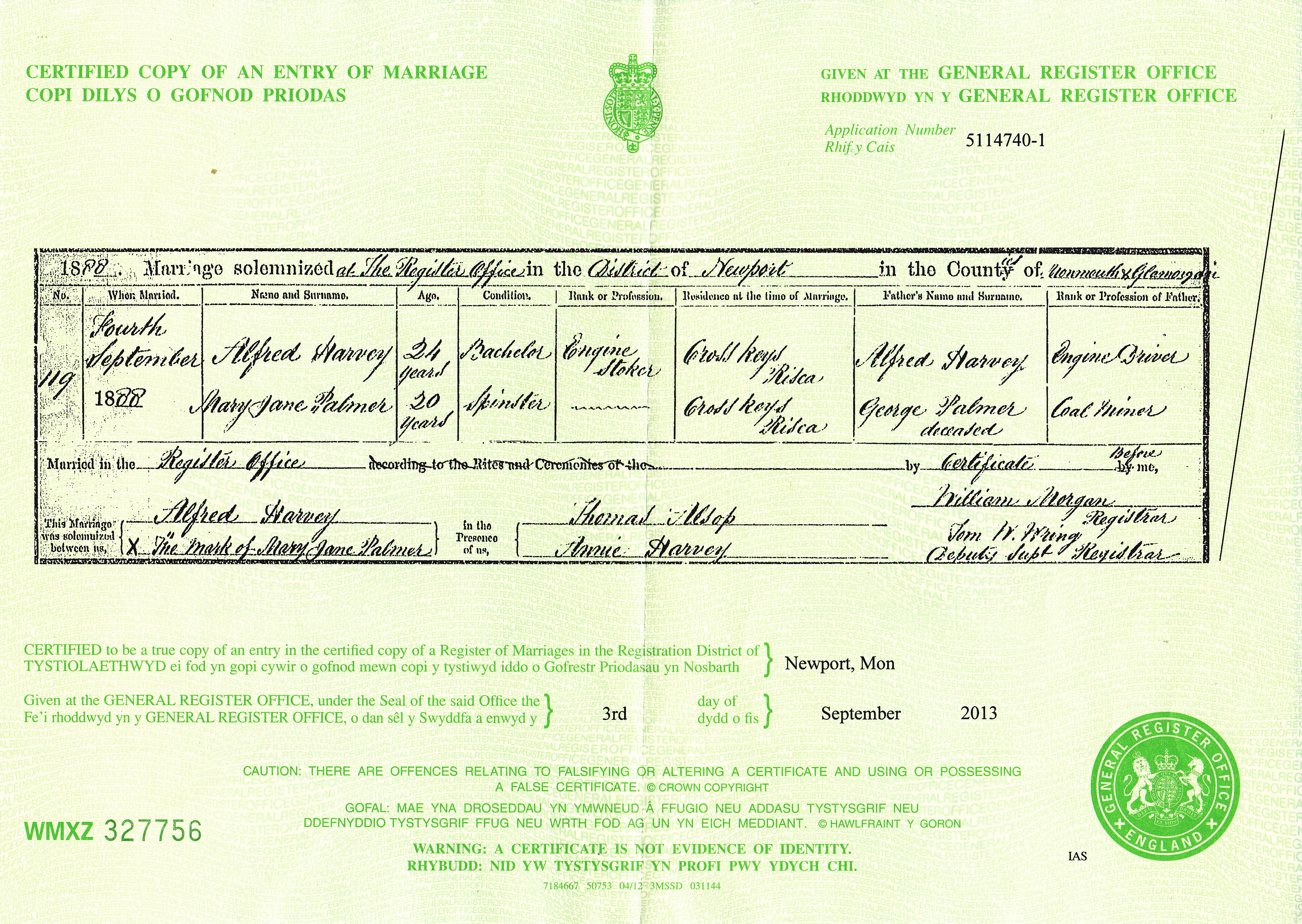 General Register Office of England and Wales; Marriage entry for Alfred Harvey and Mary Jane Palmer, Newport Mon, Jul-Sep Qtr 1888, Vol 11A, Page 277, No 119; Certified copy obtained 3 Sep 2013.