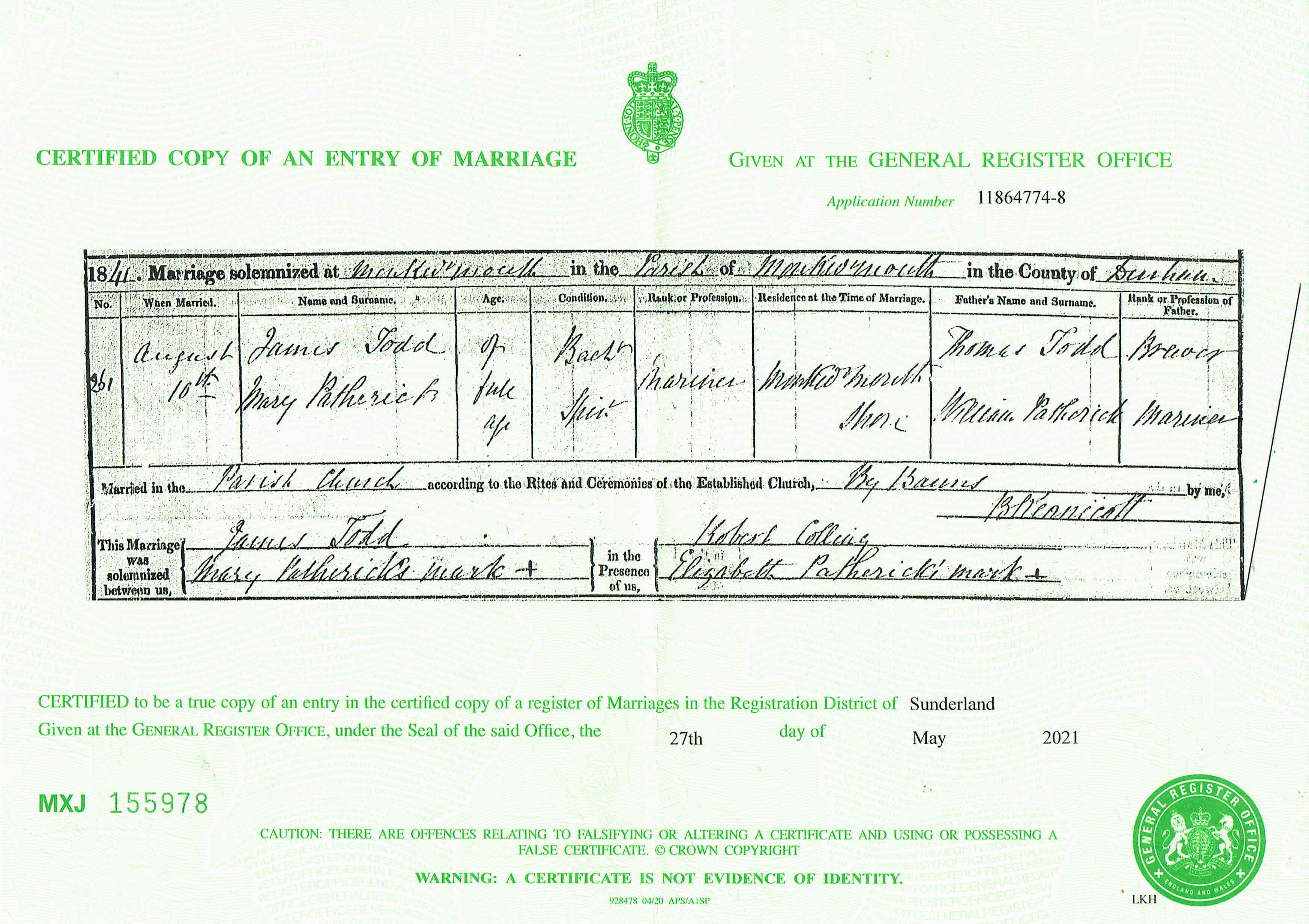 General Register Office of England and Wales; Marriage entry for James Todd and Mary Patherick, Sunderland, Jul-Sep Qtr 1851, Vol 24, Page 189, No 261; Certified copy obtained 27 May 2021.