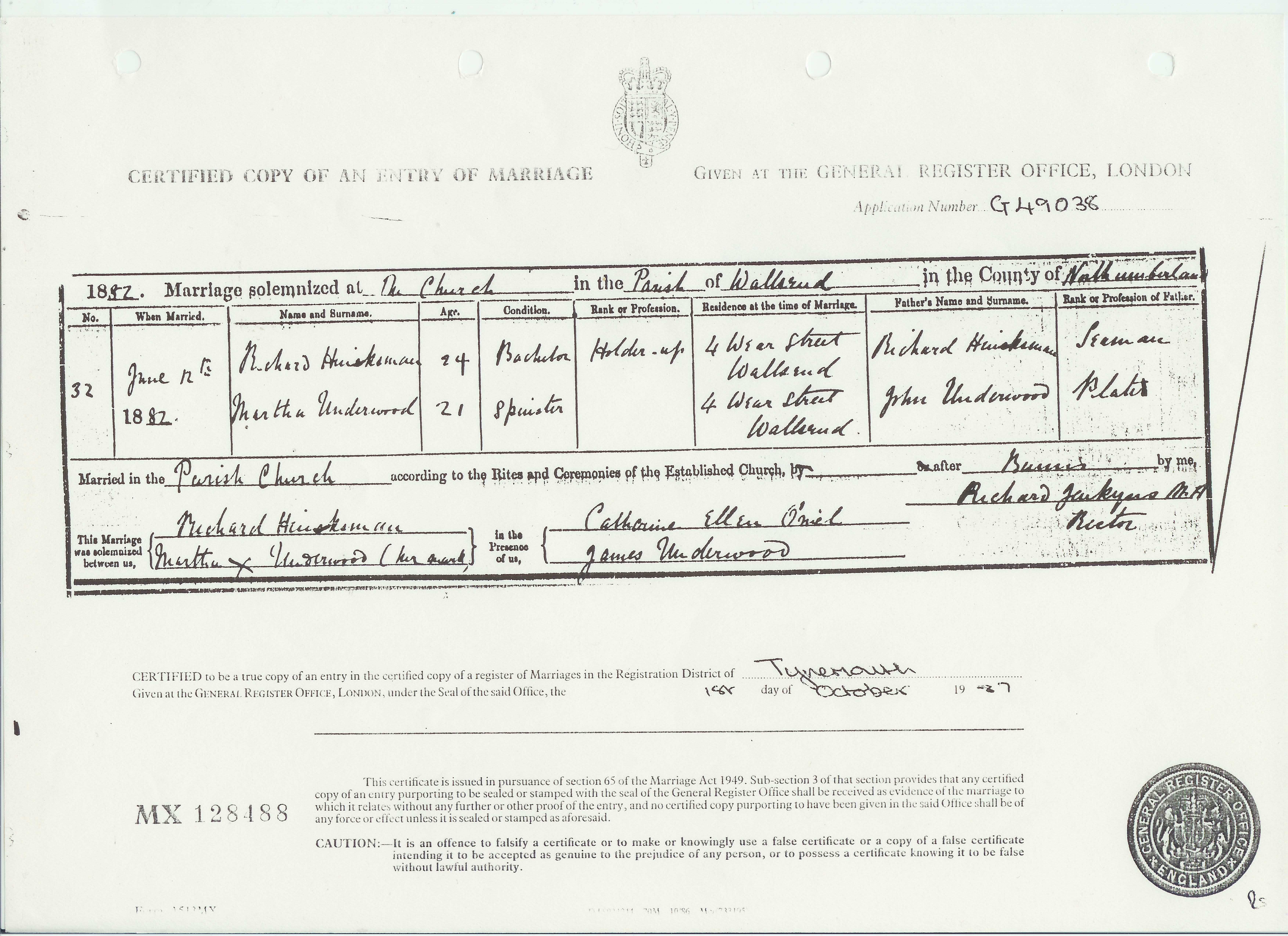 General Register Office of England and Wales; Marriage entry for Richard Hinksman and Martha Underwood, Tynemouth, Apr-Jun Qtr 1882, Vol 10b, Page 347, No 32; Certified copy obtained 18 Oct 1987.