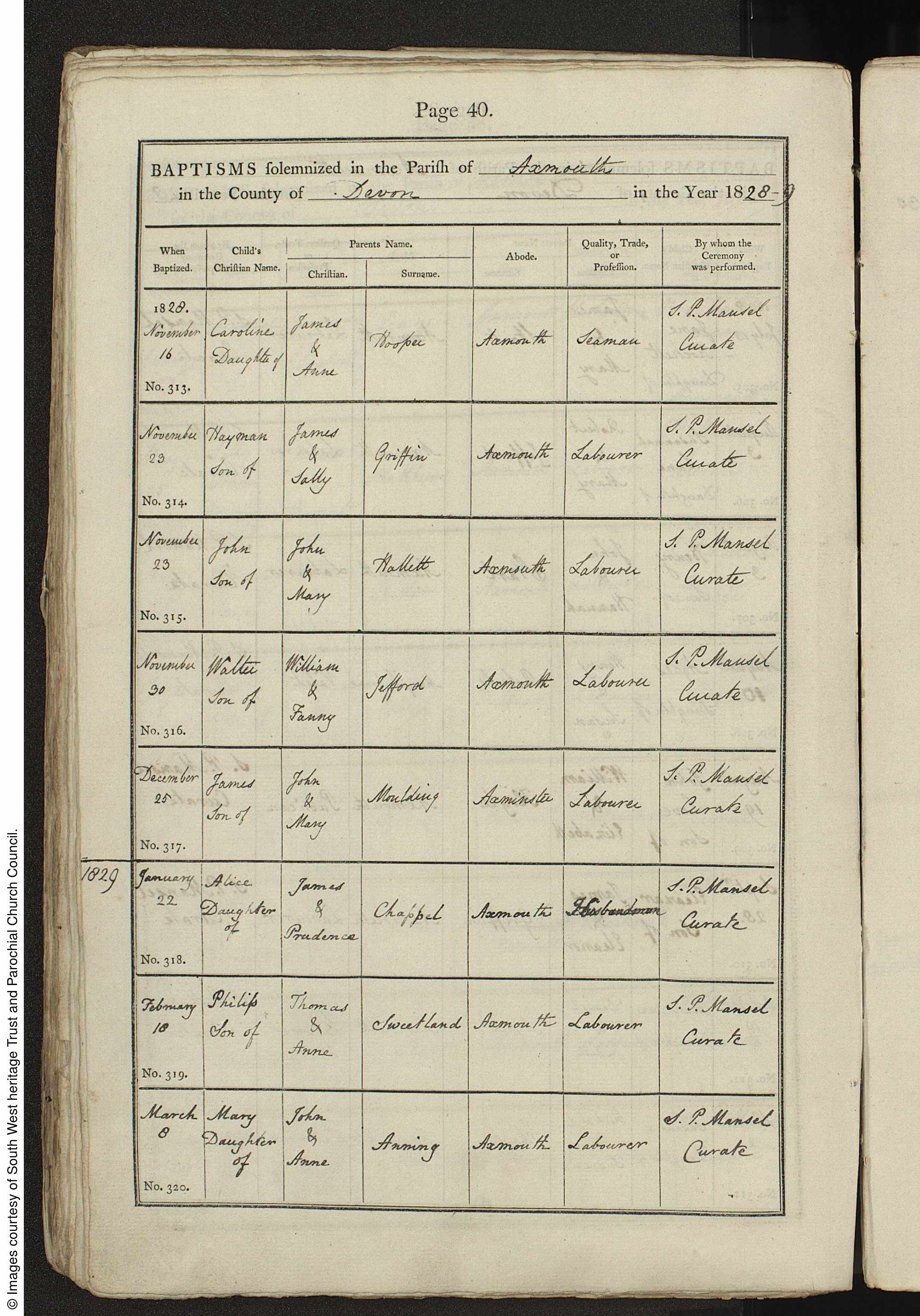 Parish Registers of St. Michael, Axmouth, Devon; Baptism entry for Philip Sweetland, 1 Feb 1829, Page 40, No 319.