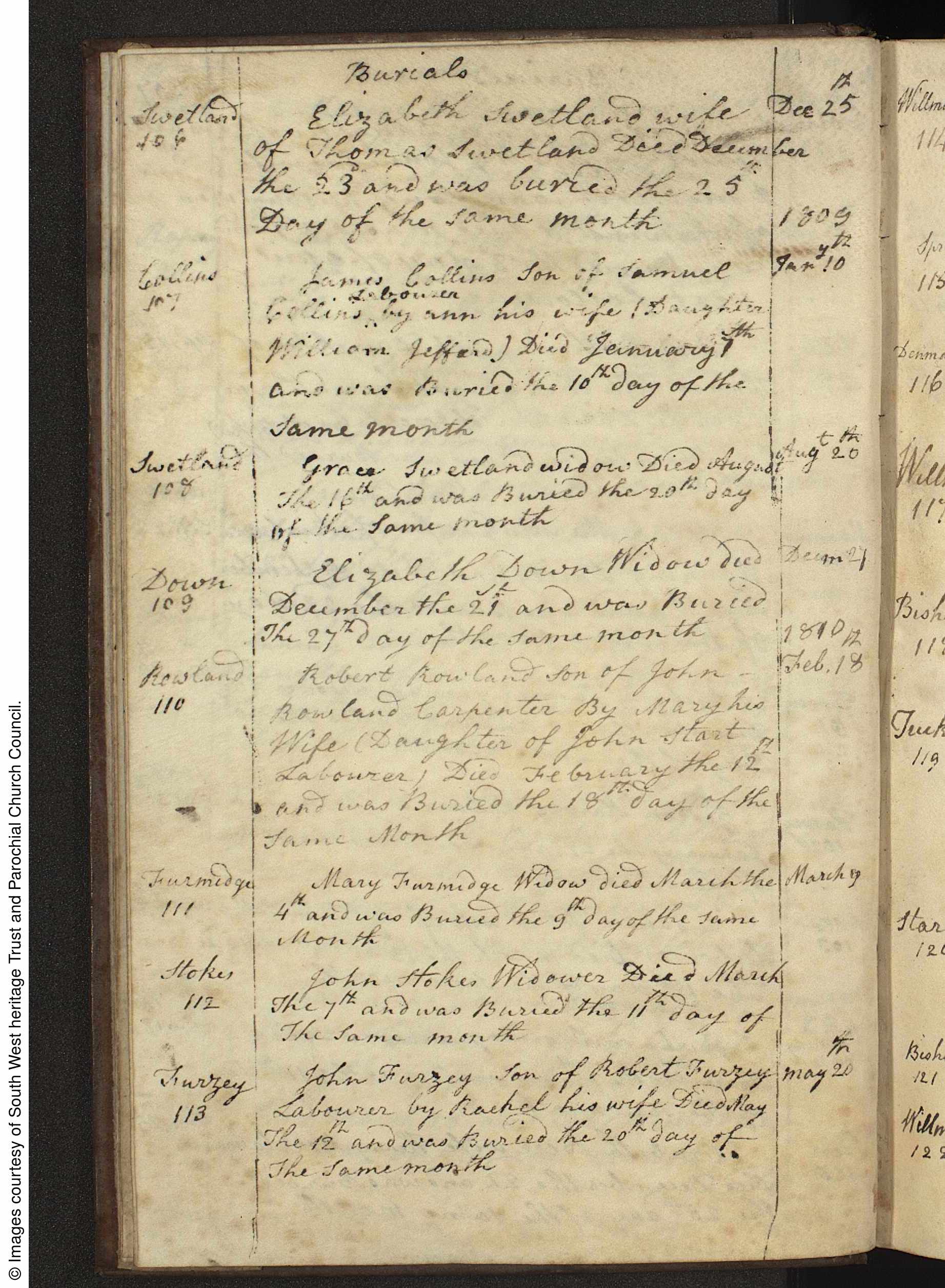 Parish Registers of St. Michael, Axmouth, Devon; Burial entry for Elizabeth Swetland, 25 Dec 1808.