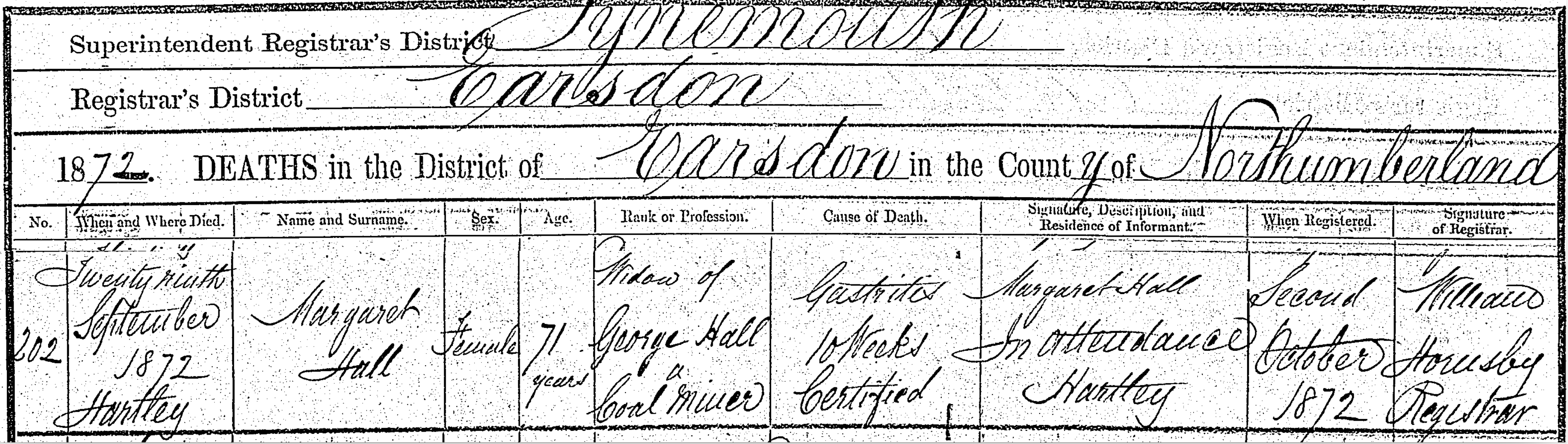 Death in the Registration District of Tynemouth, Sub-district of Earsdon, Northumberland, 1872, no. 202. Died 29 Sep 1872 at Hartley; Margaret Hall; Female; age 71; Widow of George Hall, a coal miner. Cause of death: Gastritis; 10 weeks; certified. Informant was Margaret Hall (signed name); relation: Not known; residing at Hartley; present at death. The death was registered 2 Oct 1872.