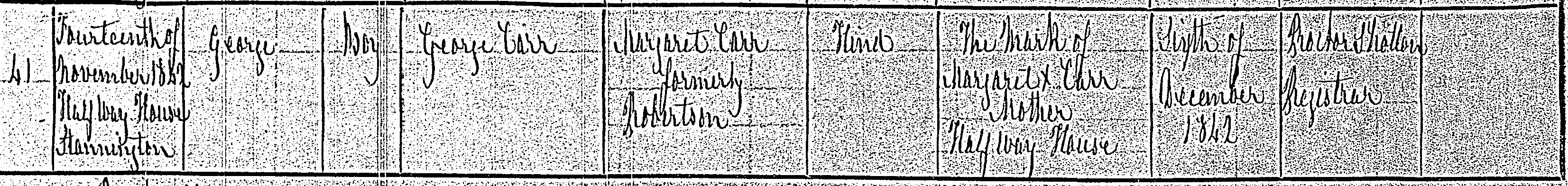 Birth in the Registration District of Castle Ward, Northumberland, 1842, no. 41. Born 13 Nov 1842 at Halfway Houuse, Stannington; George Carr; Boy; father George Carr; mother Margaret Carr, formerly Robertson. Occupation of father: Hind. Informant was Margaret Carr; Mother; Halfway House; could not sign name. The birth was registered 6 Dec 1842.