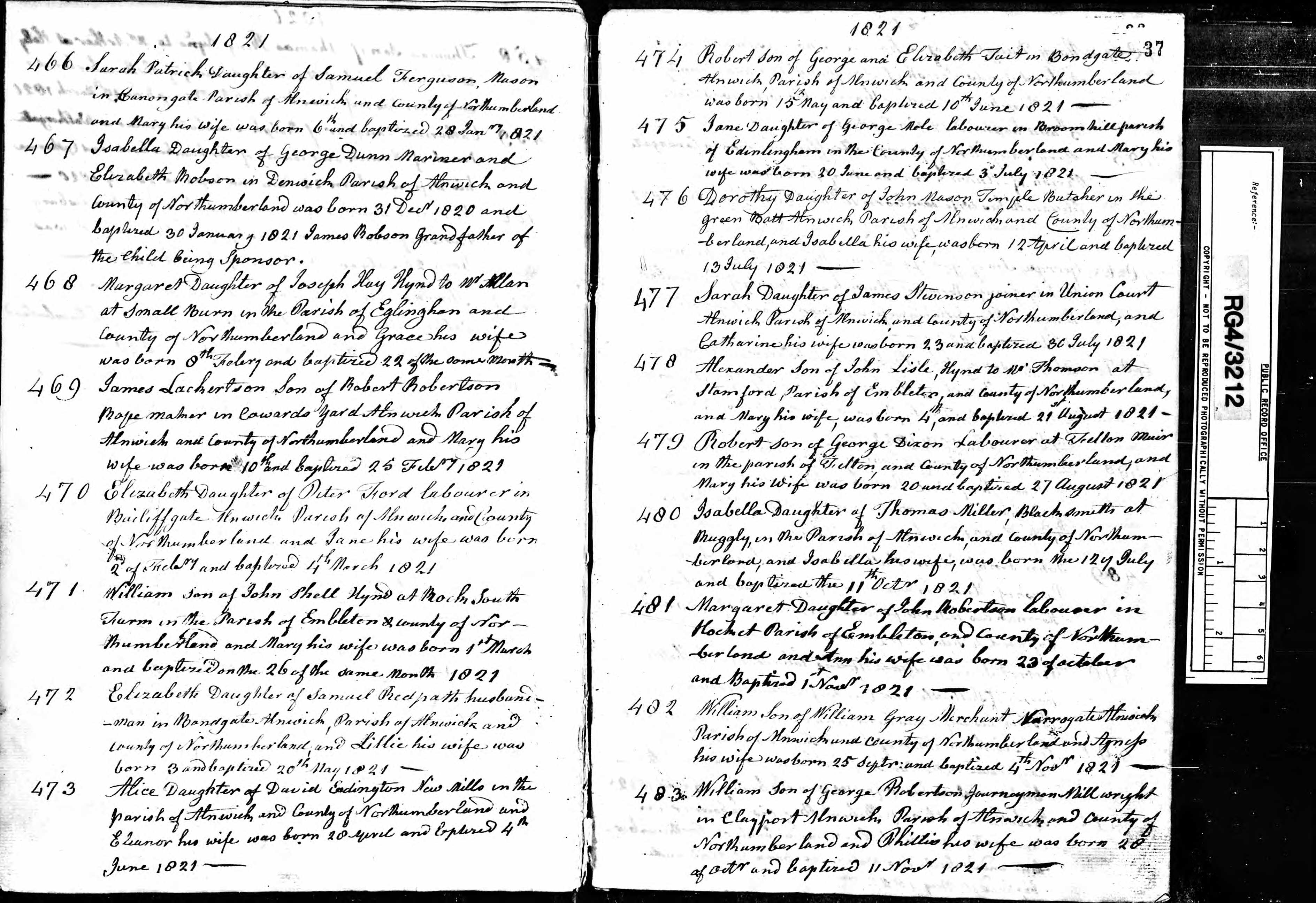 Cited from Register of Births and Baptisms for the Scotch Presbyterian Church, Pottergate Street, Alnwick, Northumberland (Scotch Presbyterian Church, Pottergate Street, Alnwic)