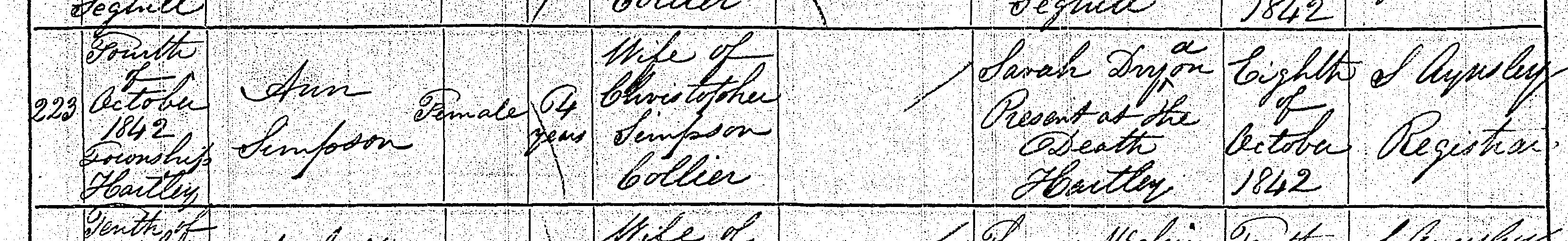 Death in the Registration District of Tynemouth, Northumberland, 1842, no. 223. Died 4 Oct 1842 at Township Hartley; Ann Simpson; Female; age 64; Wife of Christopher Simpson, Collier. Cause of death: [no cause given]. Informant was Sarah Dryaon (signed name); relation: Not known; residing at Hartley; present at death. The death was registered 8 Oct 1842.
