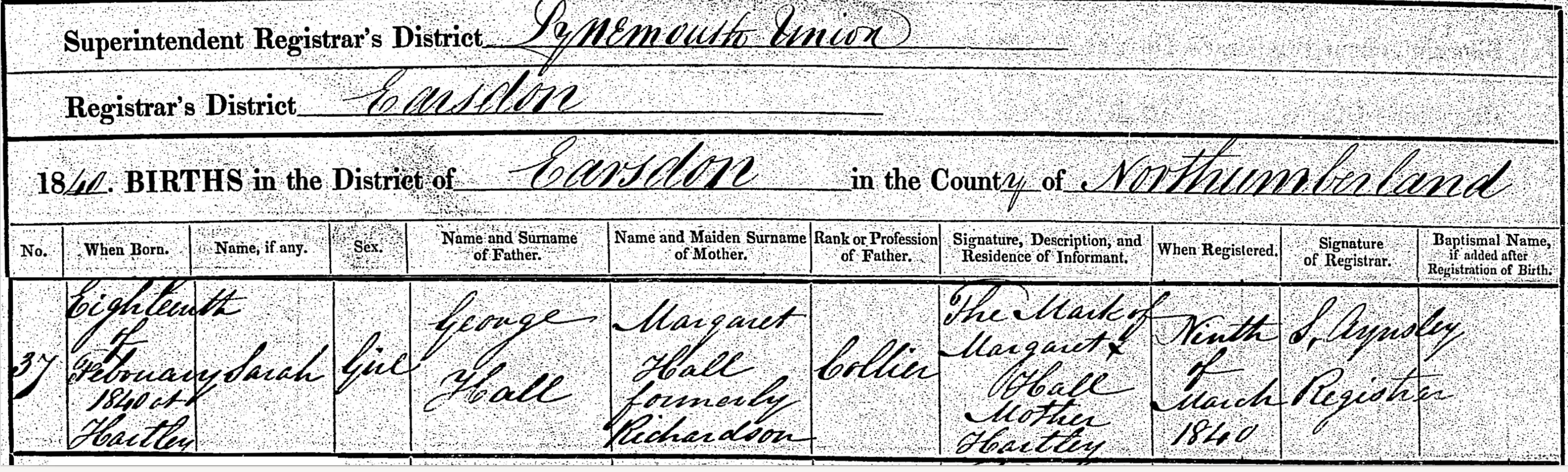 Birth in the Registration District of Tynemouth, Sub-district of Earsdon, Northumberland, 1840, no. 37. Born 18 Feb 1840 at Hartley; Sarah Hall; Girl; father George Hall; mother Margaret Hall formerly Richardson. Occupation of father: Collier. Informant was Margaret Hall; Mother; Hartley; could not sign name. The birth was registered 9 Mar 1840.