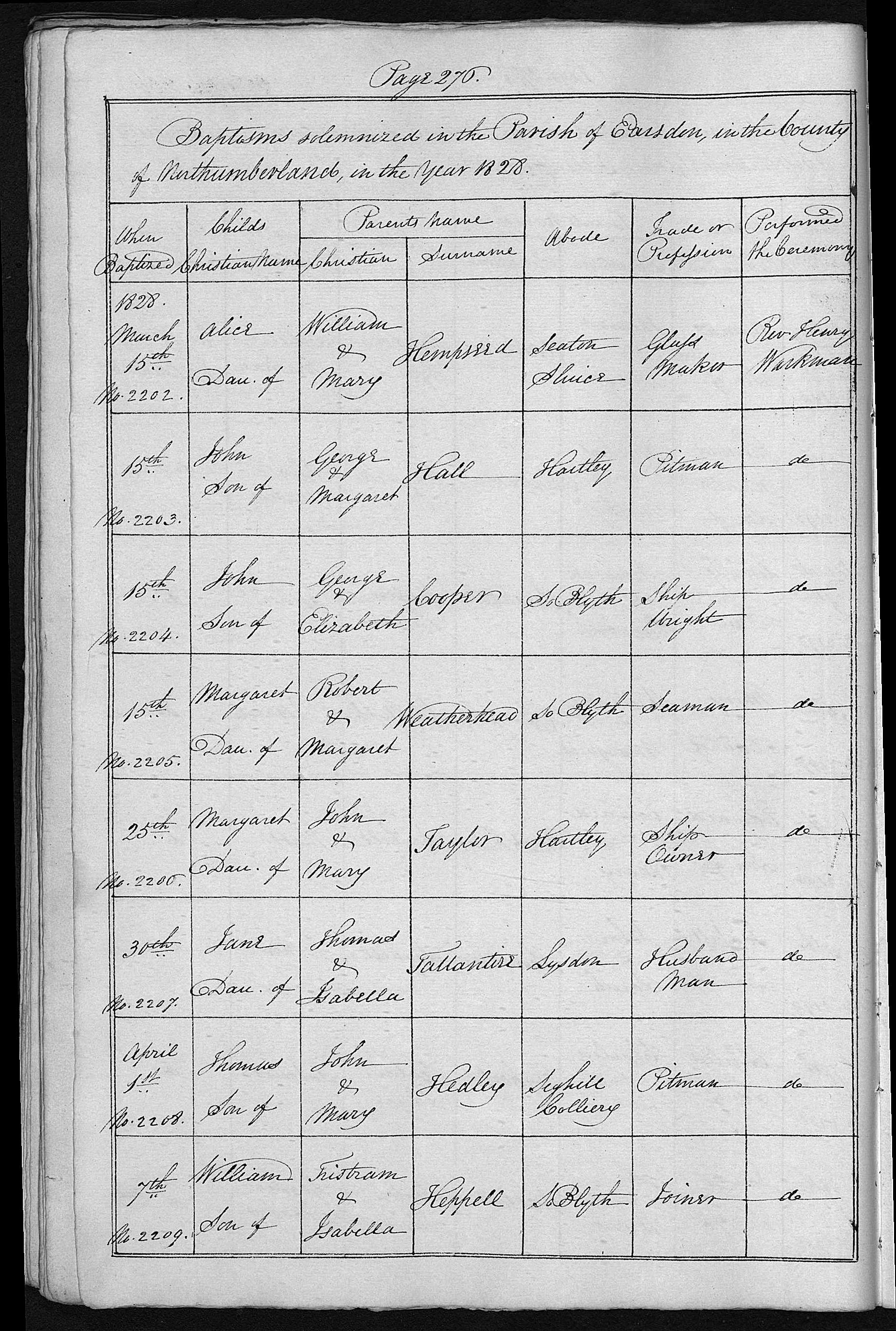 Baptism entry for John Hall, Earsdon, 15 Mar 1828, No 2203
