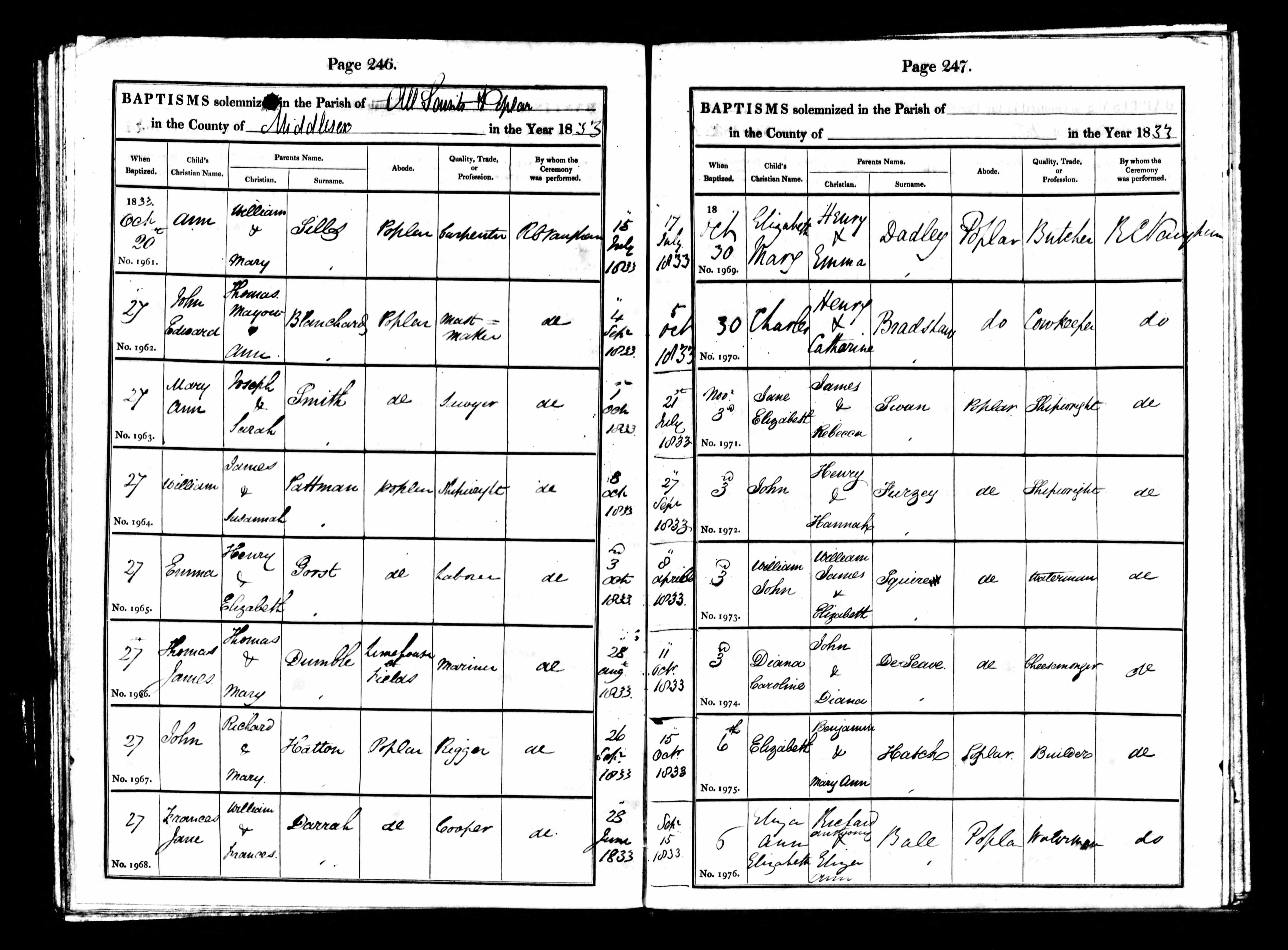 Parish Registers of All Saints, Poplar, Middlesex; Baptism entry for John Furzey, 3 Nov 1833, Page 247, No 1972.
