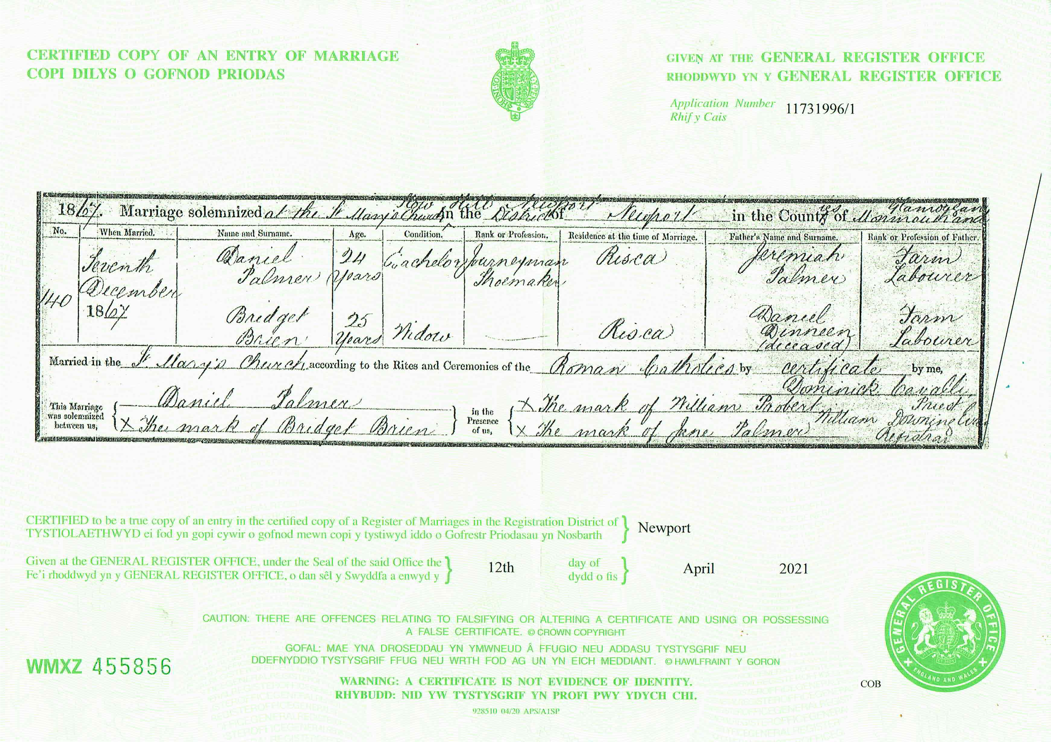 Marriage at St Mary's Church in the Registration District of Newport, district of District of Newport, Monmouth and Glamorgan, 1867, no. 140. Married 7 Dec 1867; Daniel Palmer, age 24, condition Bachelor, occupation Journeyman shoemaker, residence Riska and Bridget Brien, age 25, condition Widow, residence Riska; groom's father Jeremiah Palmer, Farm labourer; bride's father Daniel Dinneen (deceased), Farm labourer; married by Certificate according to the rites of the Roman Catholics; groom signed name, bride could not sign name; witnesses William Probert (did not sign, Jane Palmer (did not sign