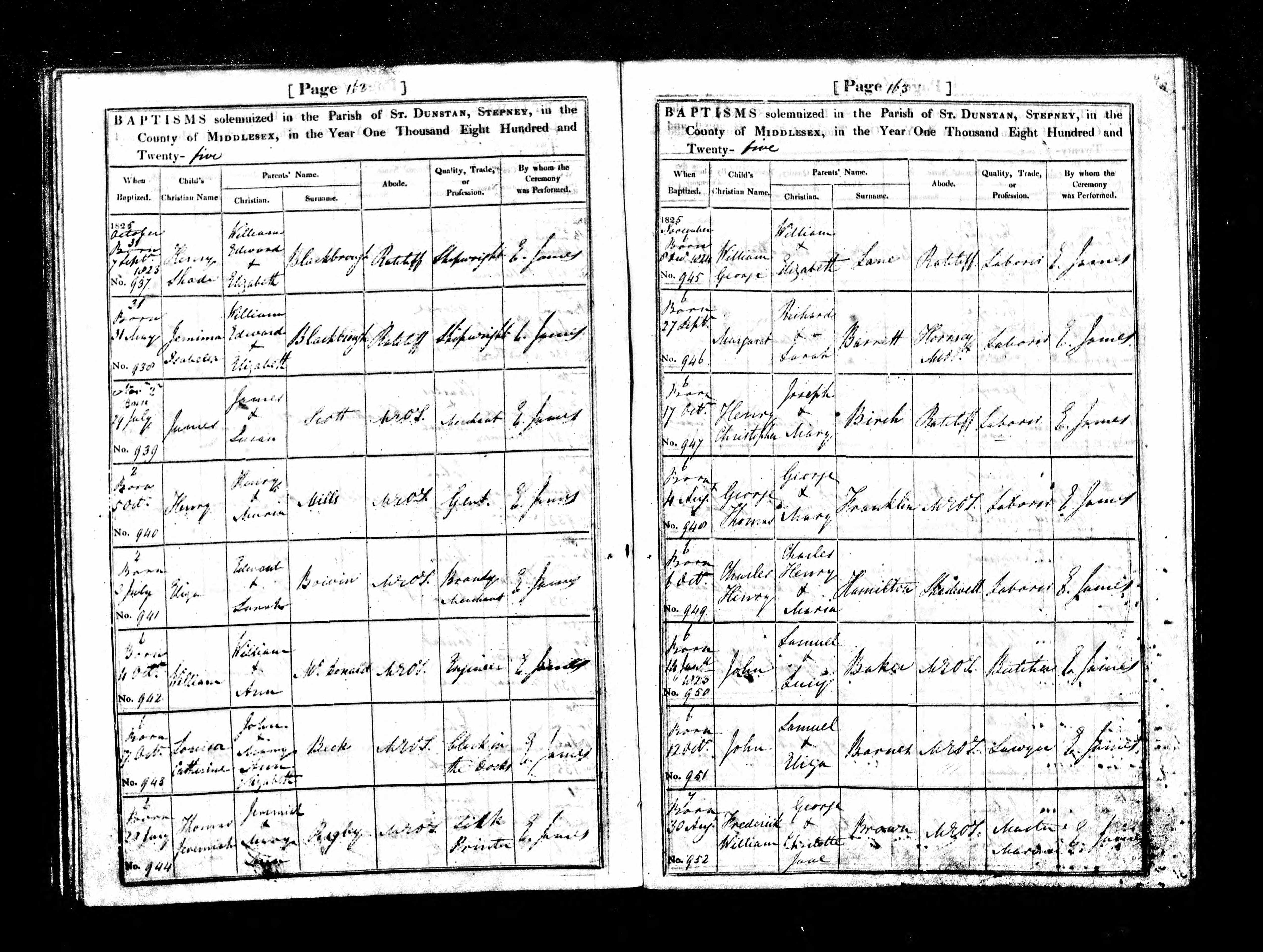 Parish Registers of St Dunstan and All Saints, Stepney, Middlesex; Baptism entry for Henry Shade Blackbrough, 31 Oct 1825, Page 162, No 937.