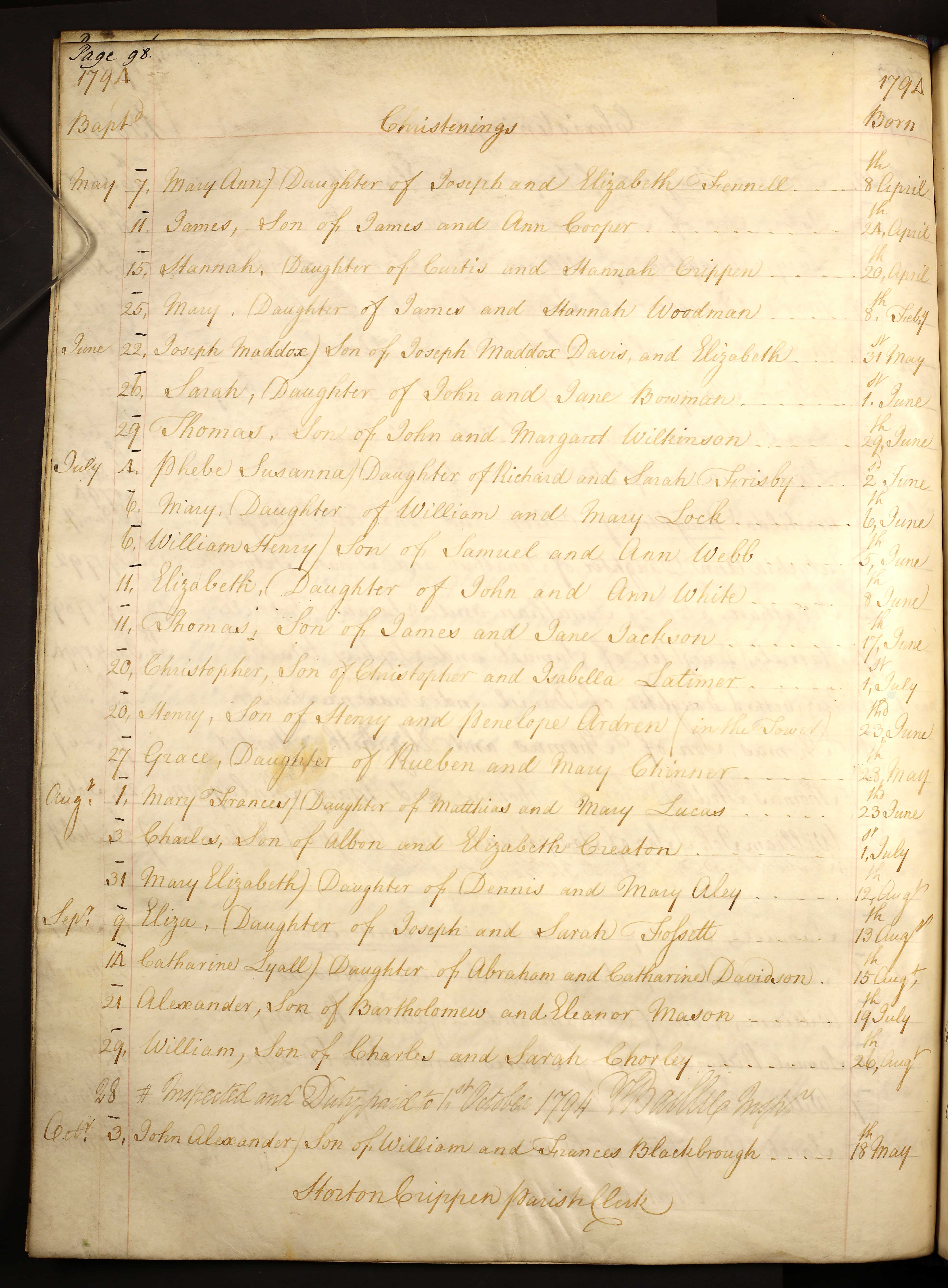 Baptism entry for John Alexander Blackbrough, 3 Oct 1794, Page 98, Folio 179A