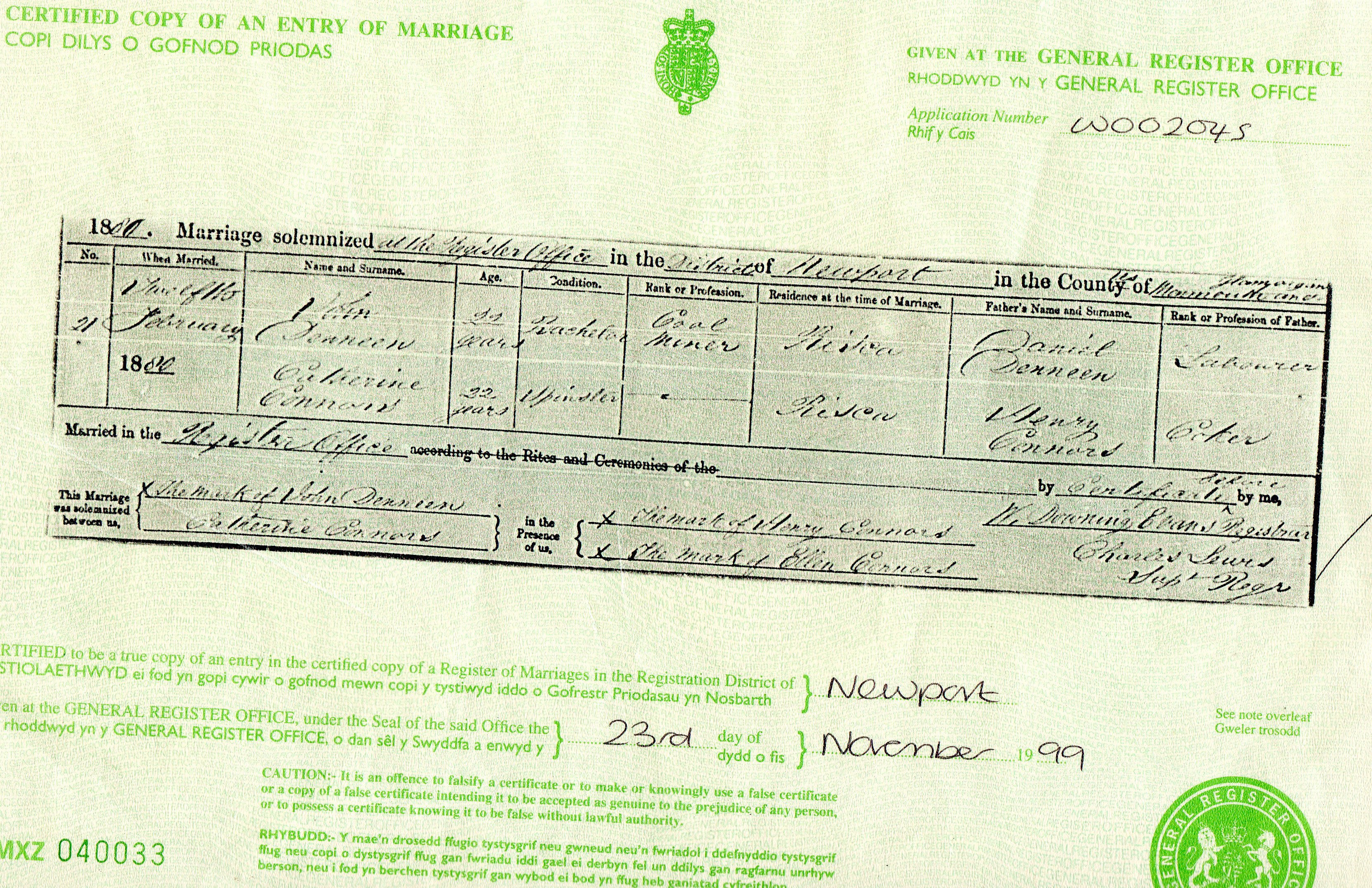 Marriage at The Register Office in the Registration District of Newport, district of District of Newport, Monmouth and Glamorgan, 1880, no. 21. Married 12 Feb 1880; John Denneen, age 22, condition Bachelor, occupation Coal Miner, residence Risca and Catherine Connors, age 22, condition Spinster, residence Risca; groom's father Daniel Denneen, Labourer; bride's father Henry Connors, Coker; married by Certificate; groom could not sign name, bride signed name; witnesses Henry Connors (did not sign, Ellen Connors (did not sign