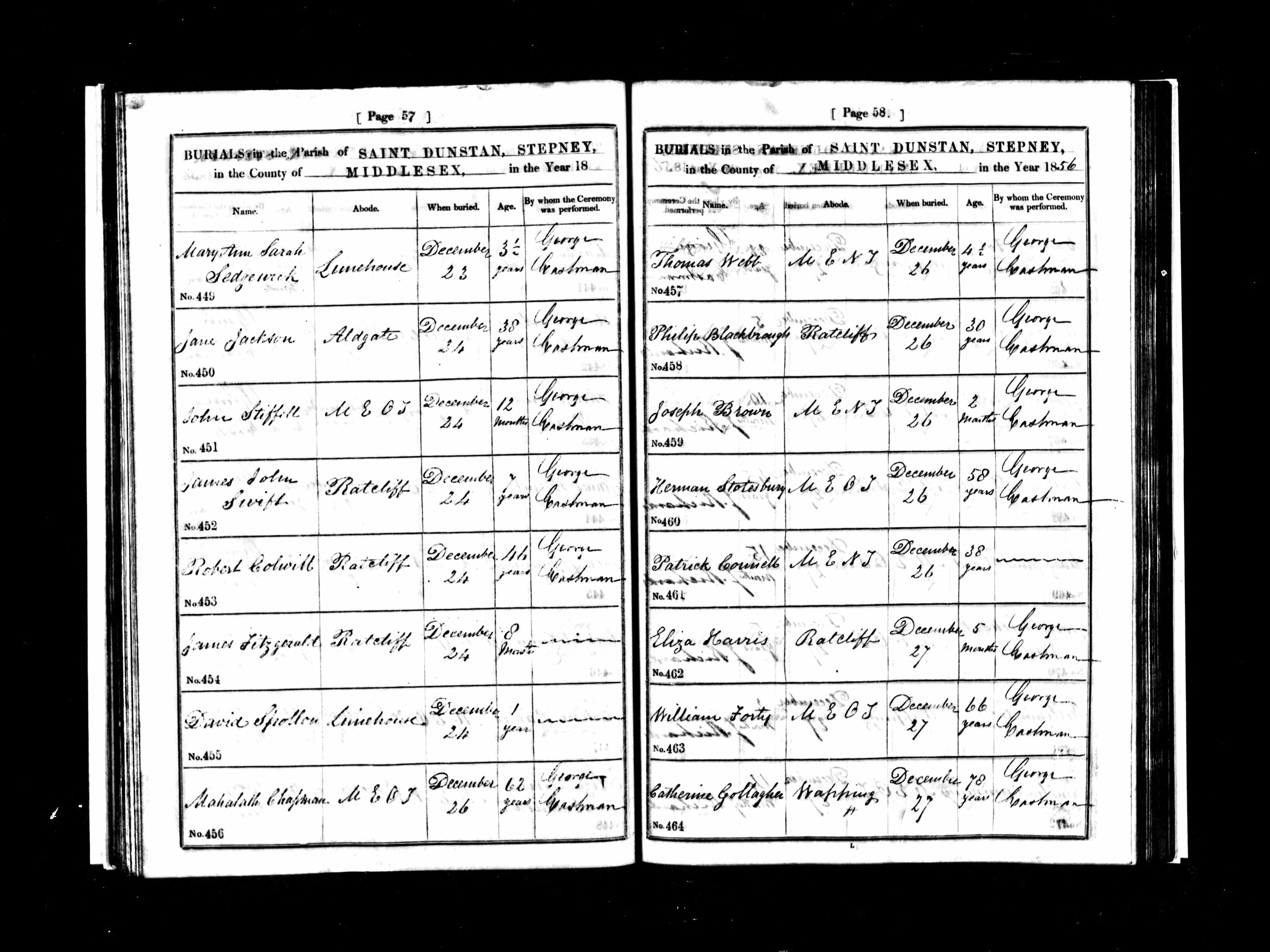 Parish Registers of St Dunstan and All Saints, Stepney, Middlesex; Burial entry for Philip Blackbrough, 26 Dec 1856, Page 58, No 458.