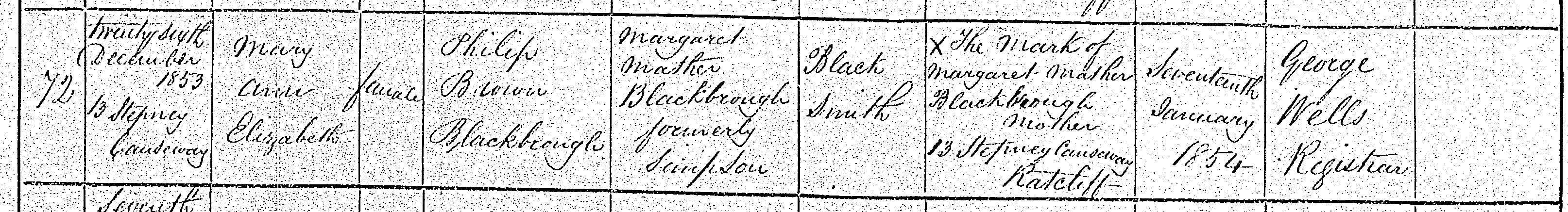 Birth in the Registration District of Stepney, London, 1853, no. 72. Born 26 Dec 1853 at 13 Stepney Causeway; Mary Ann Elizabeth Blackbrough; Girl; father Philip Brown Blackbrough; mother Margaret Mather Blackbrough formerly Simpson. Occupation of father: Black smith. Informant was Margaret Mather Blackbrough; Mother; 13 Stepney Causeway, Ratcliff; could not sign name. The birth was registered 17 Jan 1854.