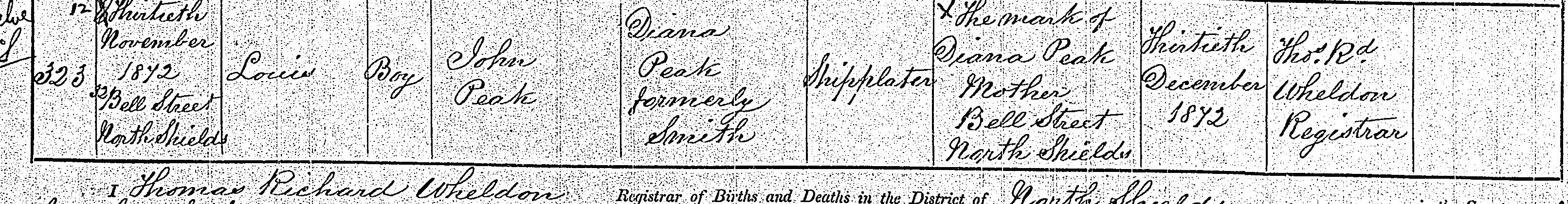 Birth in the Registration District of Tynemouth, Sub-district of South Shields, Northumberland, 1872, no. 323. Born 13 Nov 1872 at 32 Bell Street, North Shields; Louis Peak; Boy; father John Peak; mother Diana Peak formerly Smith. Occupation of father: Ship plater. Informant was Diana Peak; Mother; Bell Street, North Shields; could not sign name. The birth was registered 20 Dec 1872.