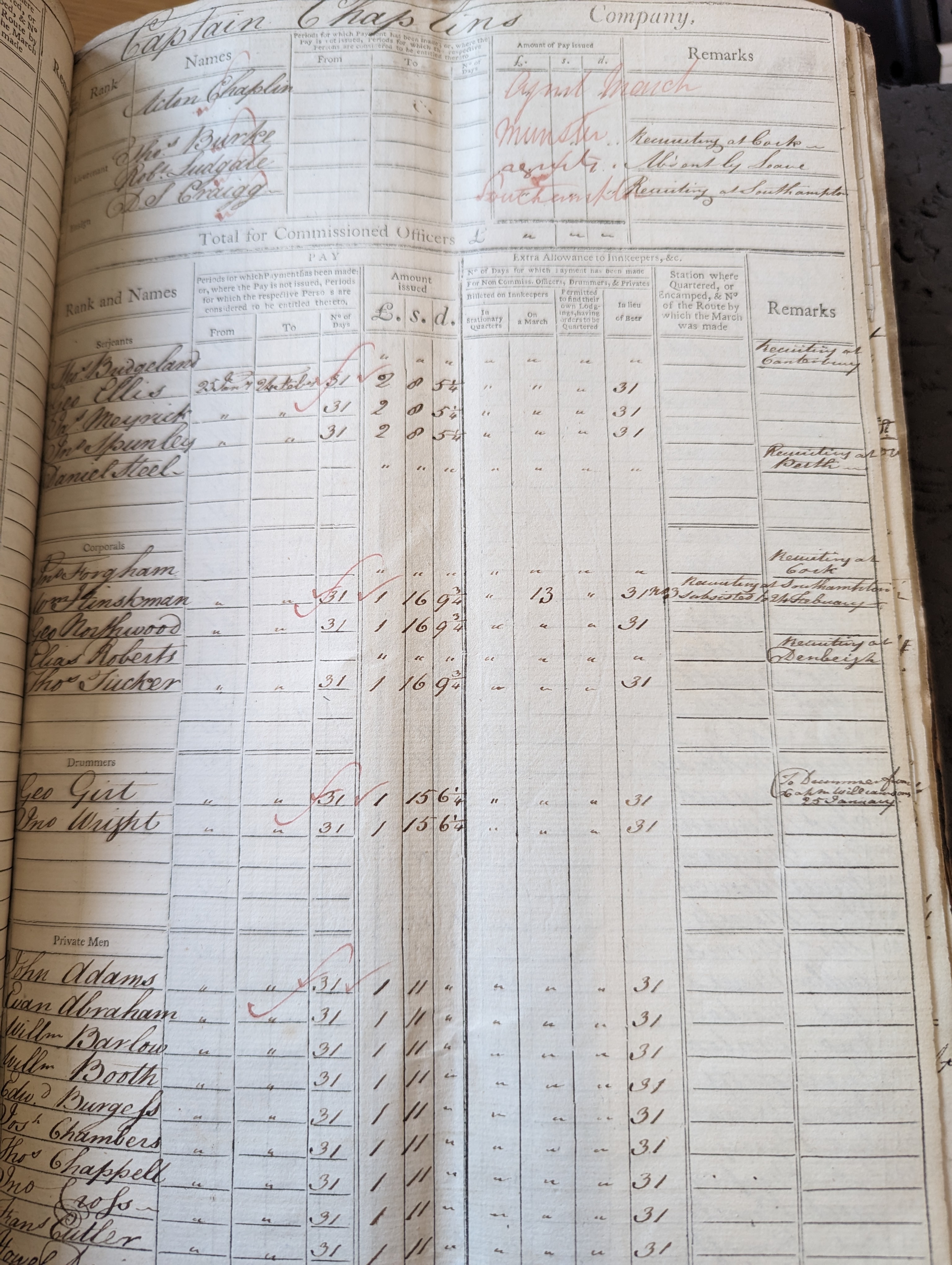 William Hinskman (sic), corporal in Captain Chaplin’s company. Remarks: “recruiting at Southampton. Subsisted to 24th February”. He took route no.3.