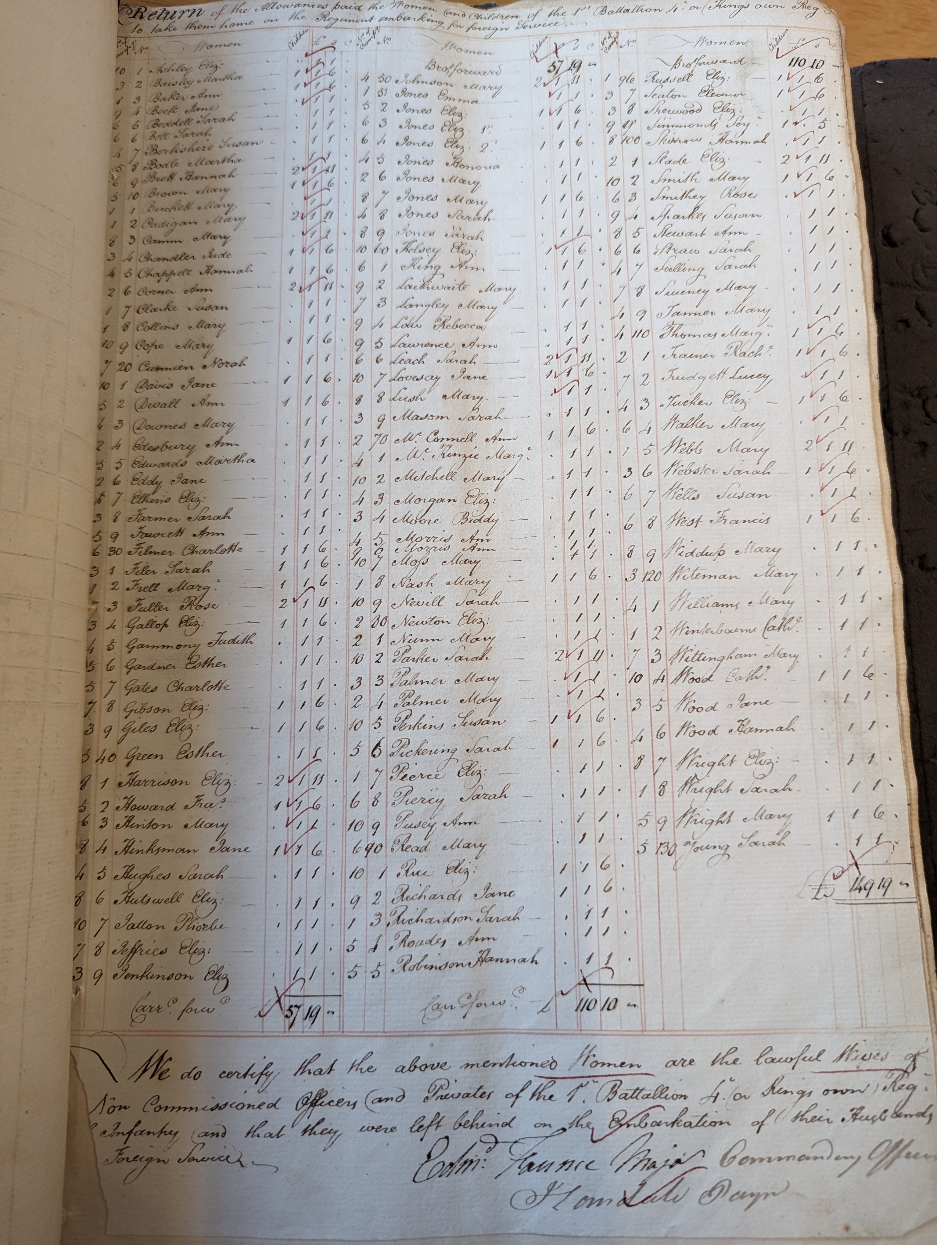 Below the list is a statement certifying that the women were the lawful wives of non commissioned officers and privates and that they were left behind on the embarkation of their husbands.