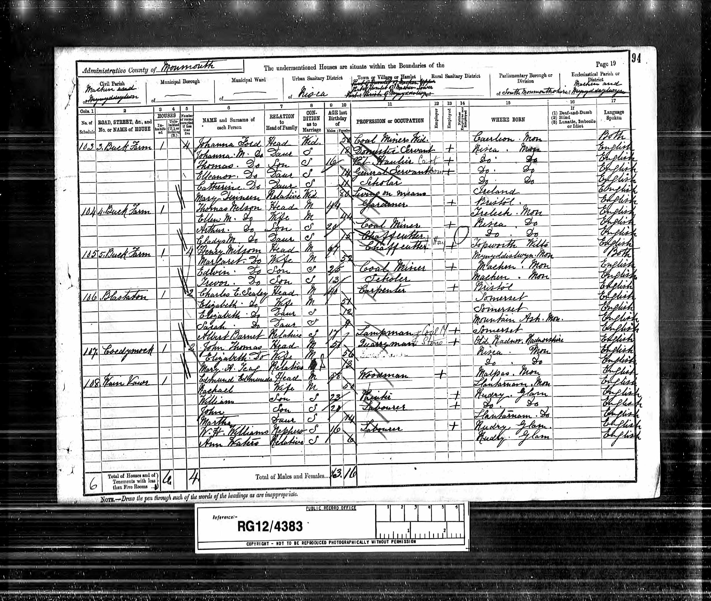- was recorded in the census on 5 Apr, 1891 at 3 Buck Farm, Lower Machen, Machen, Monmouthshire, Wales
