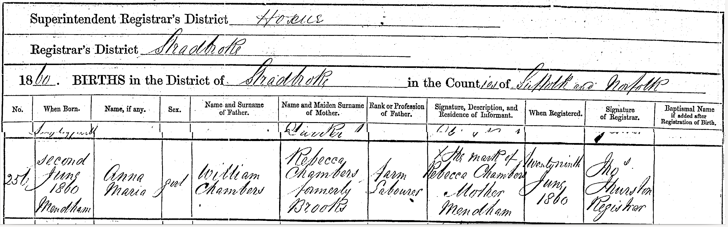 Birth in the Registration District of Hoxne, Sub-district of Stradbroke, Suffolk and Norfolk, 1860, no. 256. Born 2 Jun 1860 at Mendham; Anna Maria Chambers; Girl; father William Chambers; mother Rebecca Chambers formerly Brooks. Occupation of father: Farm labourer. Informant was Rebecca Chambers; Mother; Mendham; could not sign name. The birth was registered 29 Jun 1860.