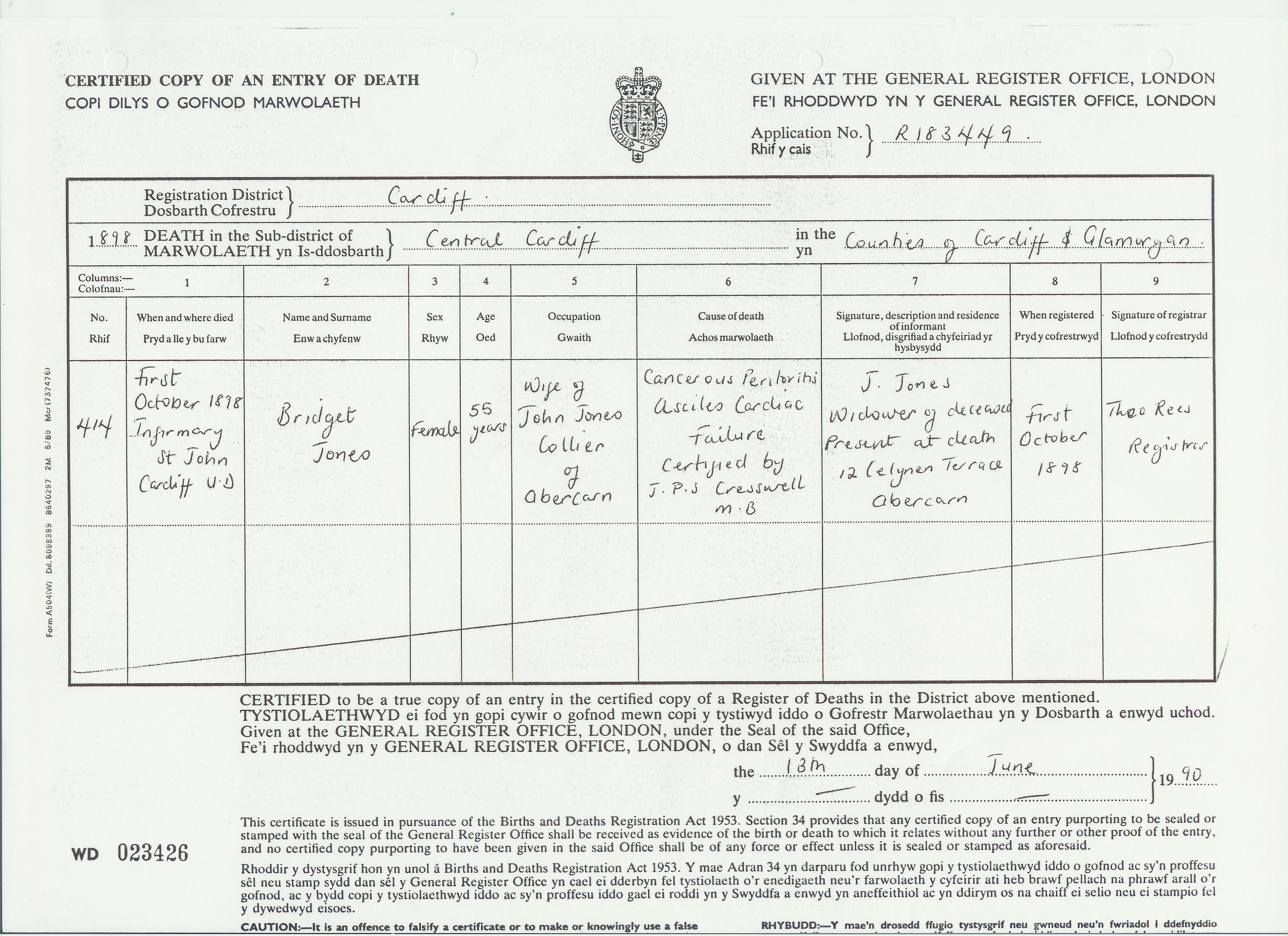 General Register Office of England and Wales; Death entry for Bridget Jones, Cardiff, Oct-Dec Qtr 1898, Vol 11A, Page 163, No 414; Certified copy (transcribed) obtained 18 Jun 1990.