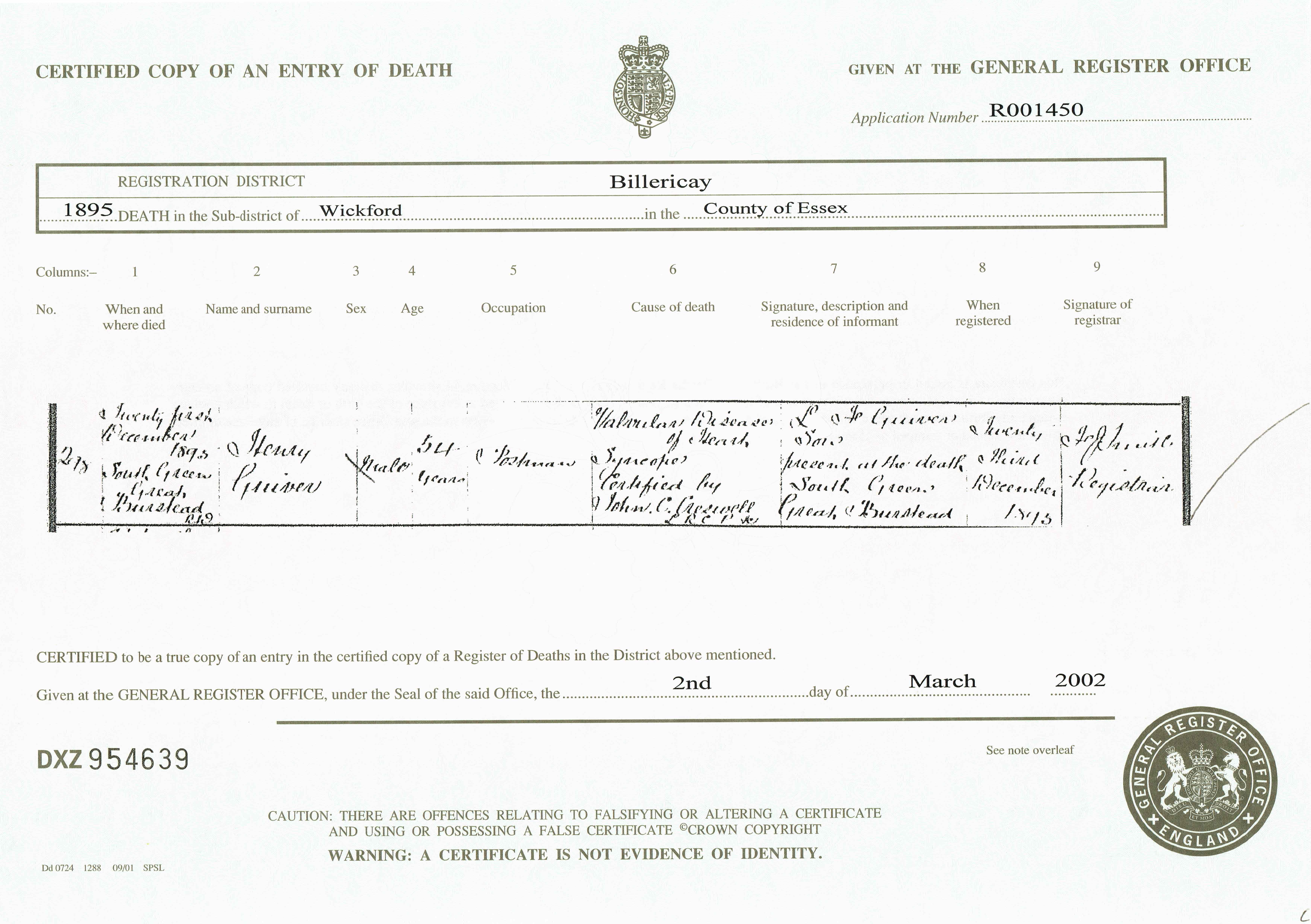 General Register Office of England and Wales; Death entry for Henry Guiver, Billericay, Oct-Dec Qtr 1895, Vol 4A, Page 259, No 218; Certified copy obtained 2 Mar 2002.