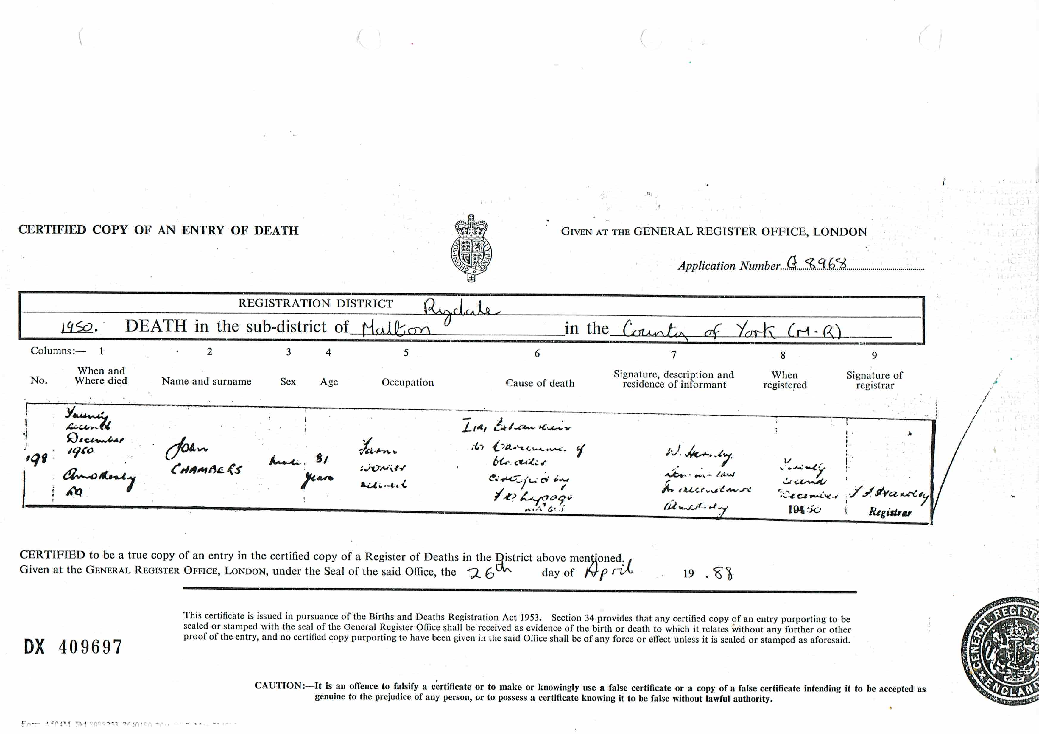 Death in the Registration District of Rydale, Sub-district of Malton, York, 1950, no. 198. Died 27 Dec 1950 at Amotherby; John Chambers; Male; age 81; Farm worker, retired. Cause of death: 1a exhaustion, b carcinoma of bladder; certified. Informant was W. Hornby (signed name); relation: Son in law; residing at Amotherby; present at death. The death was registered 29 Dec 1950.