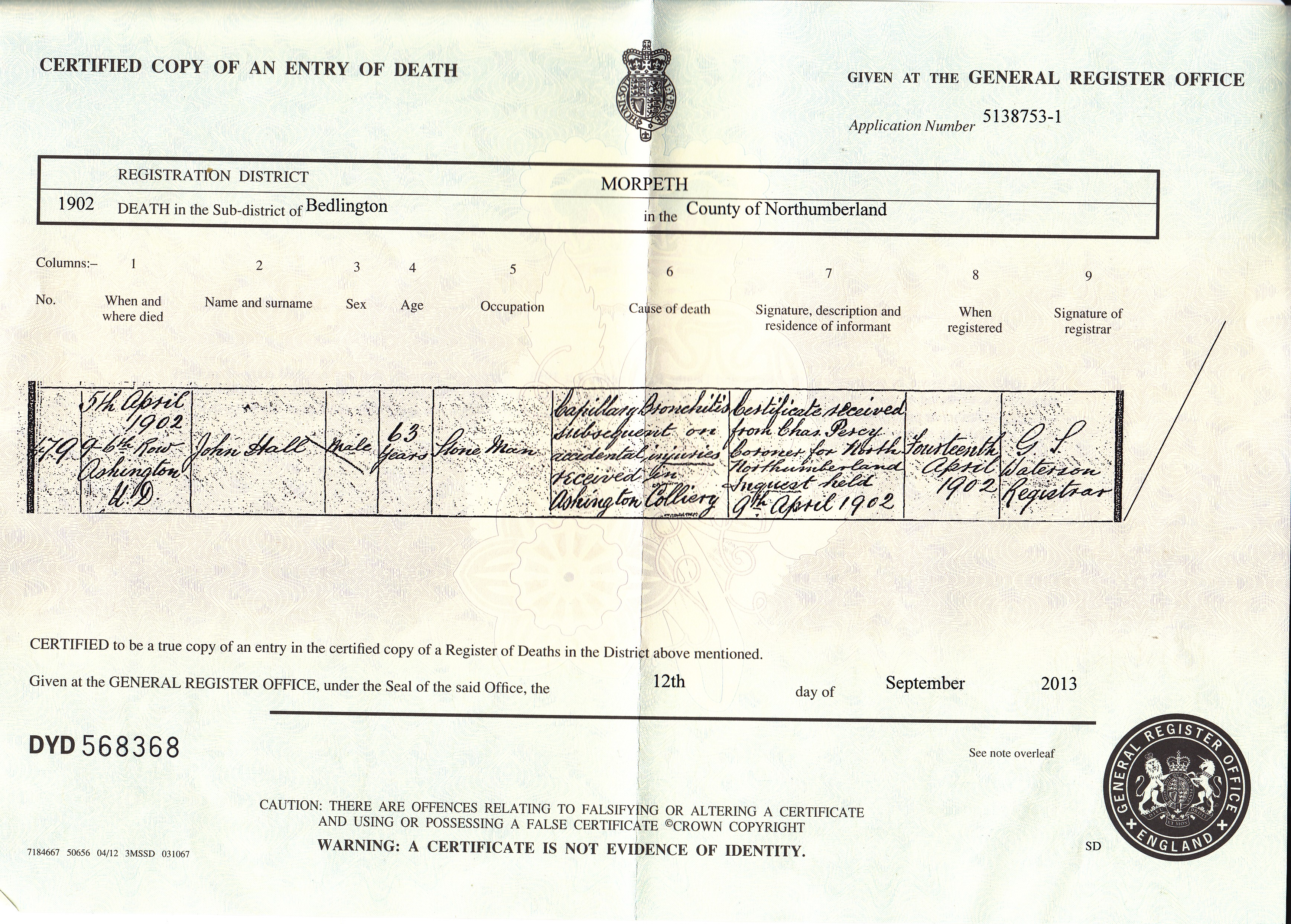 Death in the Registration District of Morpeth, Sub-district of Bedlington, Northumberland, 1902, no. 479. Died 5 Apr 1902 at 9-6th Row, Ashington; John Hall; Male; age 63; Stone Man. Cause of death: Capillary Bronchitis subsequent on accidental injuries received in Ashington Colliery. Informant was Chas Percy; relation: Coroner for Northumberland. The death was registered 14 Apr 1902. In place of informant is written: Certificate received from Chas. Percy, Coroner for Northumberland. Inquest held 9th April 1902.