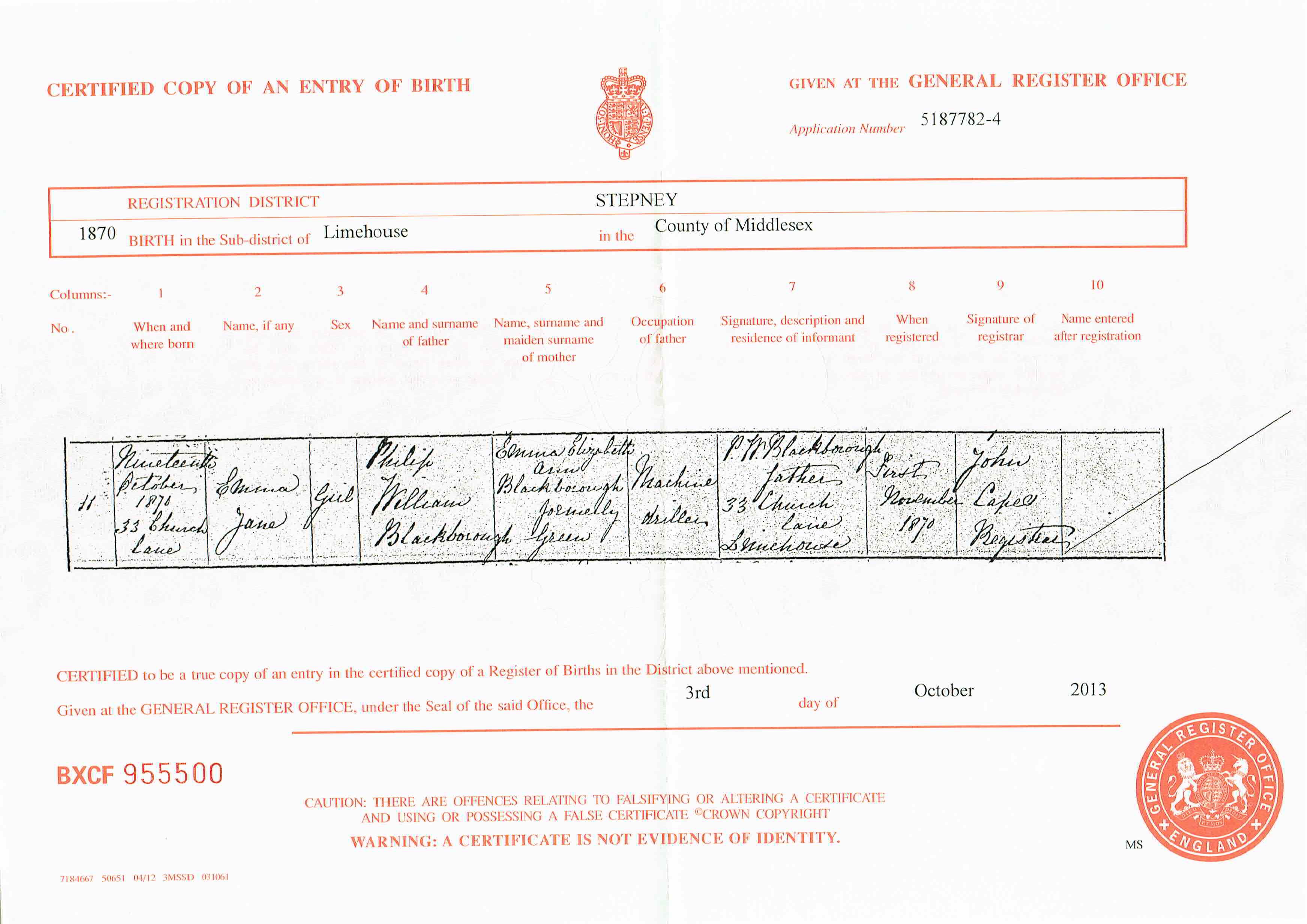Birth in the Registration District of Stepney, Sub-district of Limehouse, Middlesex, 1870, no. 11. Born 19 Oct 1870 at 33 Church Lane; Emma Jane Blackborough; Girl; father Philip William Blackborough; mother Emma Elizabeth Ann Blackborough formerly Green. Occupation of father: Machine driller. Informant was P W Blackborough; Father; 33 Church Lane, Limehouse; signed name. The birth was registered 1 Nov 1870.