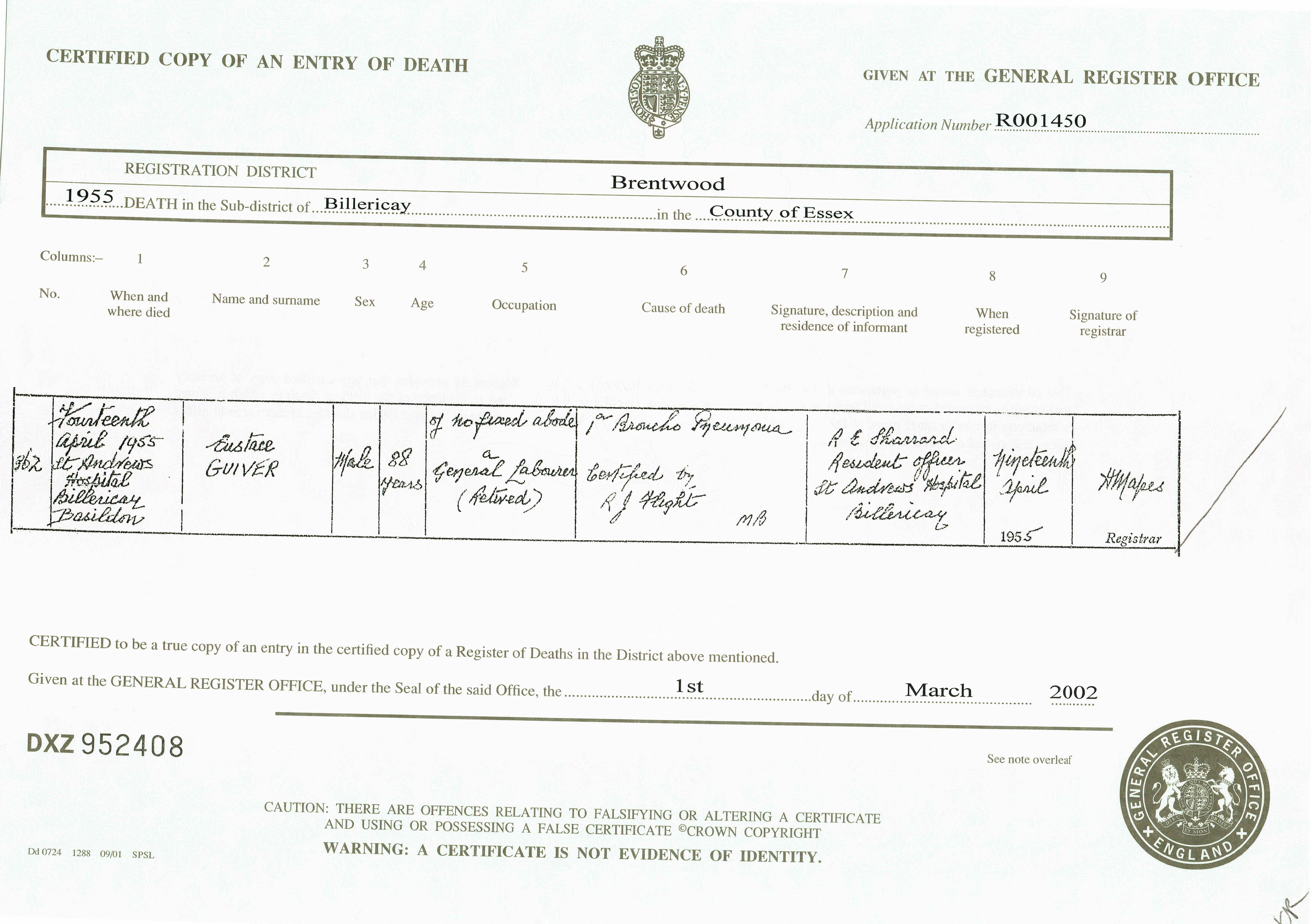 Death in the Registration District of Brentwood, Sub-district of Billericay, Essex, 1955, no. 362. Died 14 Apr 1955 at St Andrews Hospital, Billericay, Basildon; Eustace Guiver; Male; age 88; Of no fixed abode, a general labourer (retired); cause of death was 1a broncho pneumonia; certified. Informant was R. E. Sharrard; St Andrews Hospital, Billericay; signed name. The death was registered 19 Apr 1955.