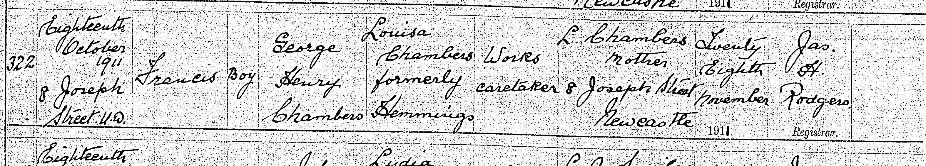 Birth in the Registration District of Newcastle upon Tyne, Northumberland, 1911, no. 322. Born 18 Oct 1911 at 8 Joseph Street; Francis Chambers; Boy; father George Henry Chambers; mother Louisa Chambers formerly Hemmings. Occupation of father: Works caretaker. Informant was L. Chambers; Mother; 8 Joseph Street, Newcastle; signed name. The birth was registered 28 Nov 1911.