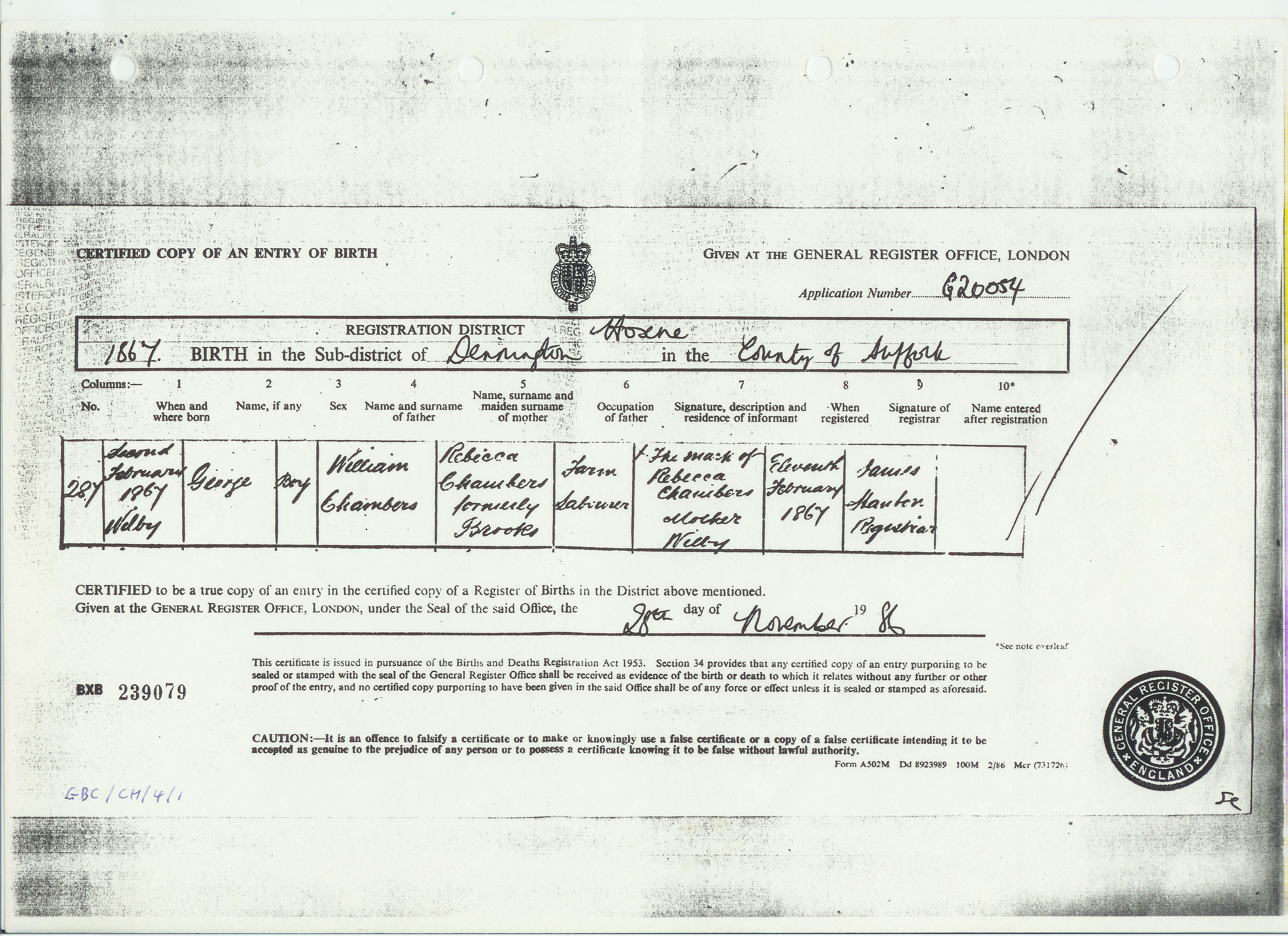 Birth in the Registration District of Hoxne, Sub-district of Dennington, Suffolk, 1867, no. 287. Born 2 Feb 1867 at Wilby; George Chambers; Boy; father William Chambers; mother Rebecca Chambers formerly Brooks. Occupation of father: Farm Labourer. Informant was Rebecca Chambers; Mother; Wilby; could not sign name. The birth was registered 11 Feb 1867.