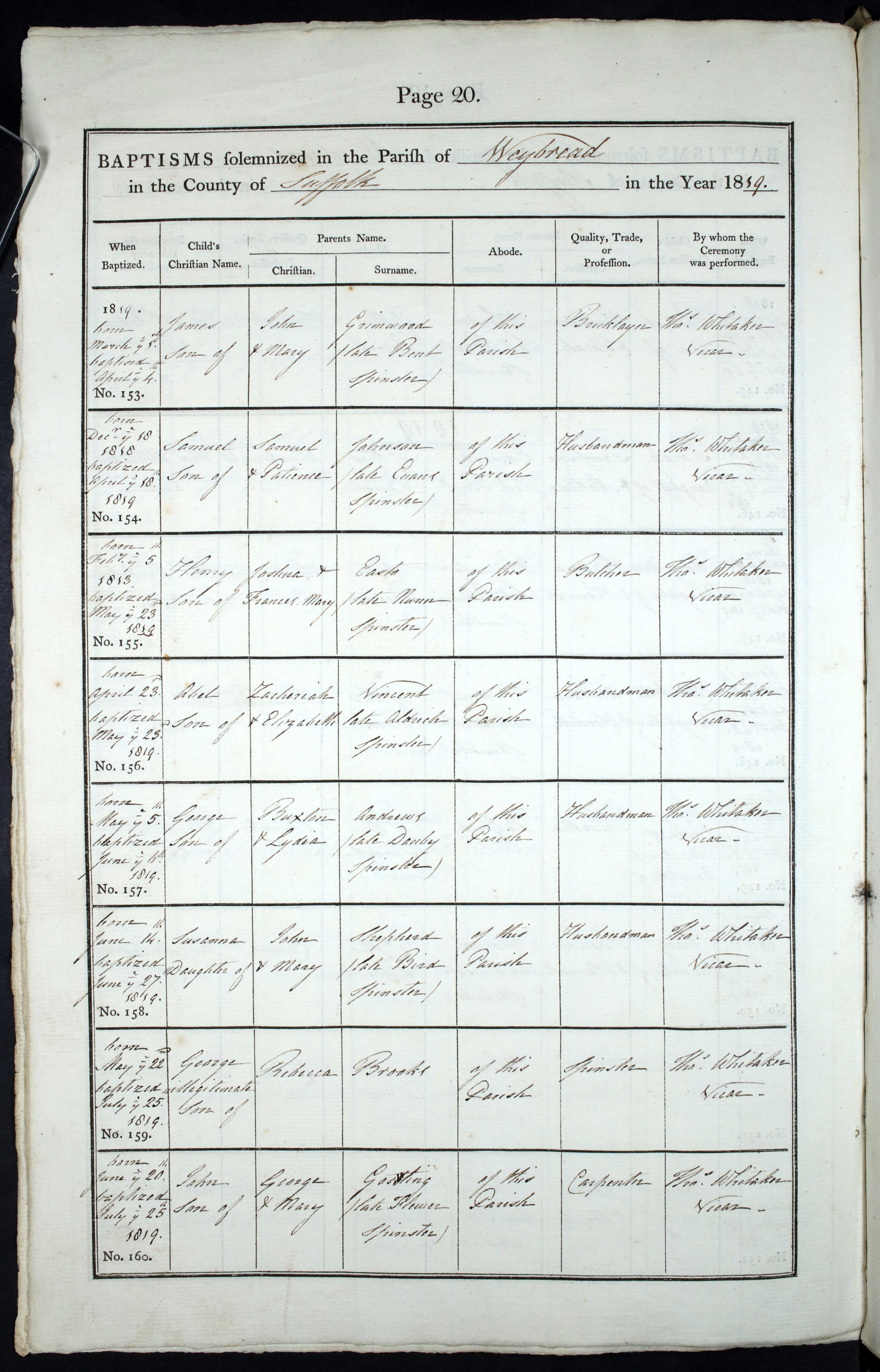 Parish Registers of St. Andrew, Weybread, Suffolk; Baptism entry for George Brooks, 25 Jul 1819, Page 20, No 159.