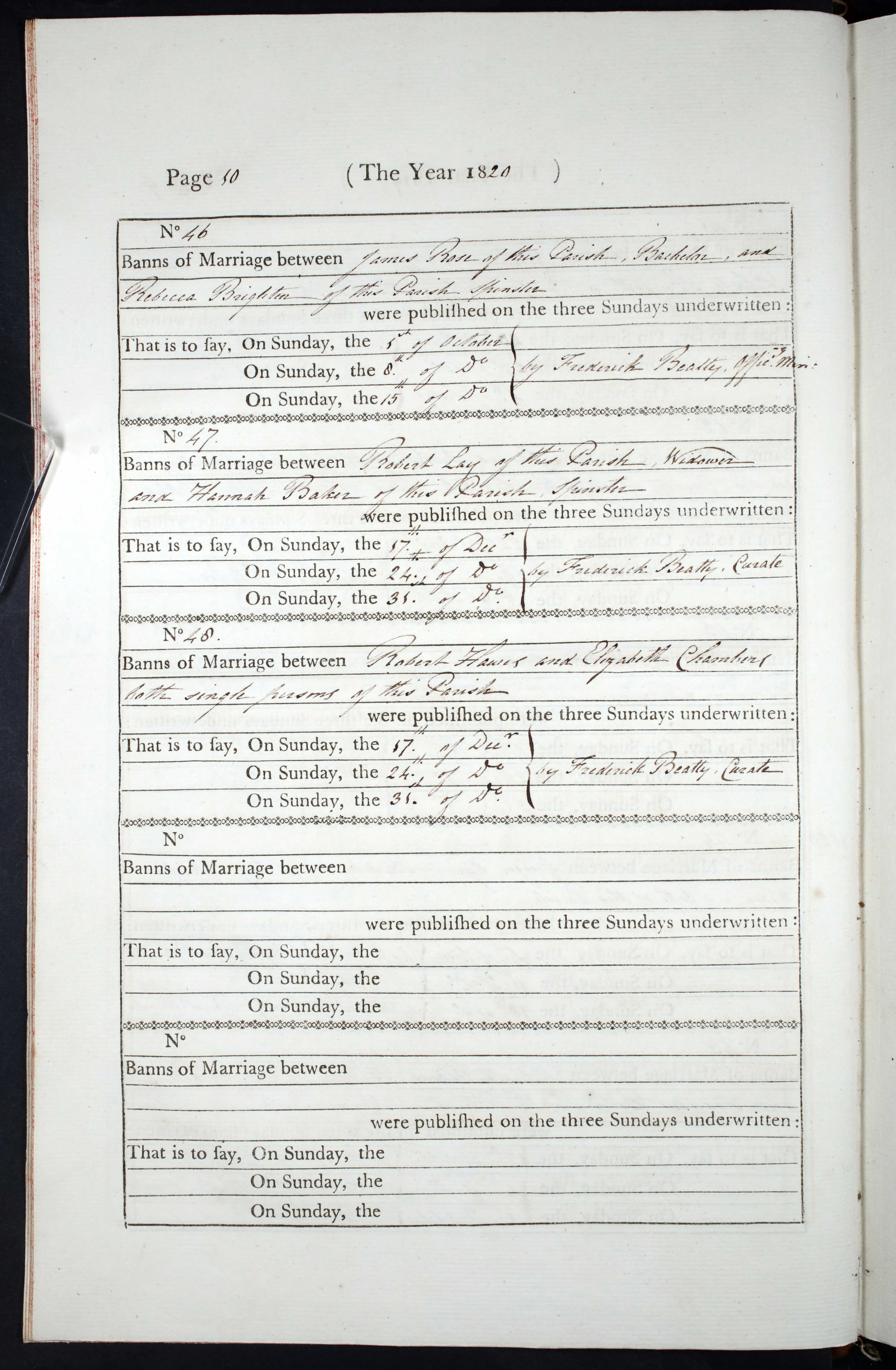 Marriage banns entry for James Rose and Rebecca Brighten, 1 Oct, 8 Oct, 15 Oct 1820, Page 50, No 46