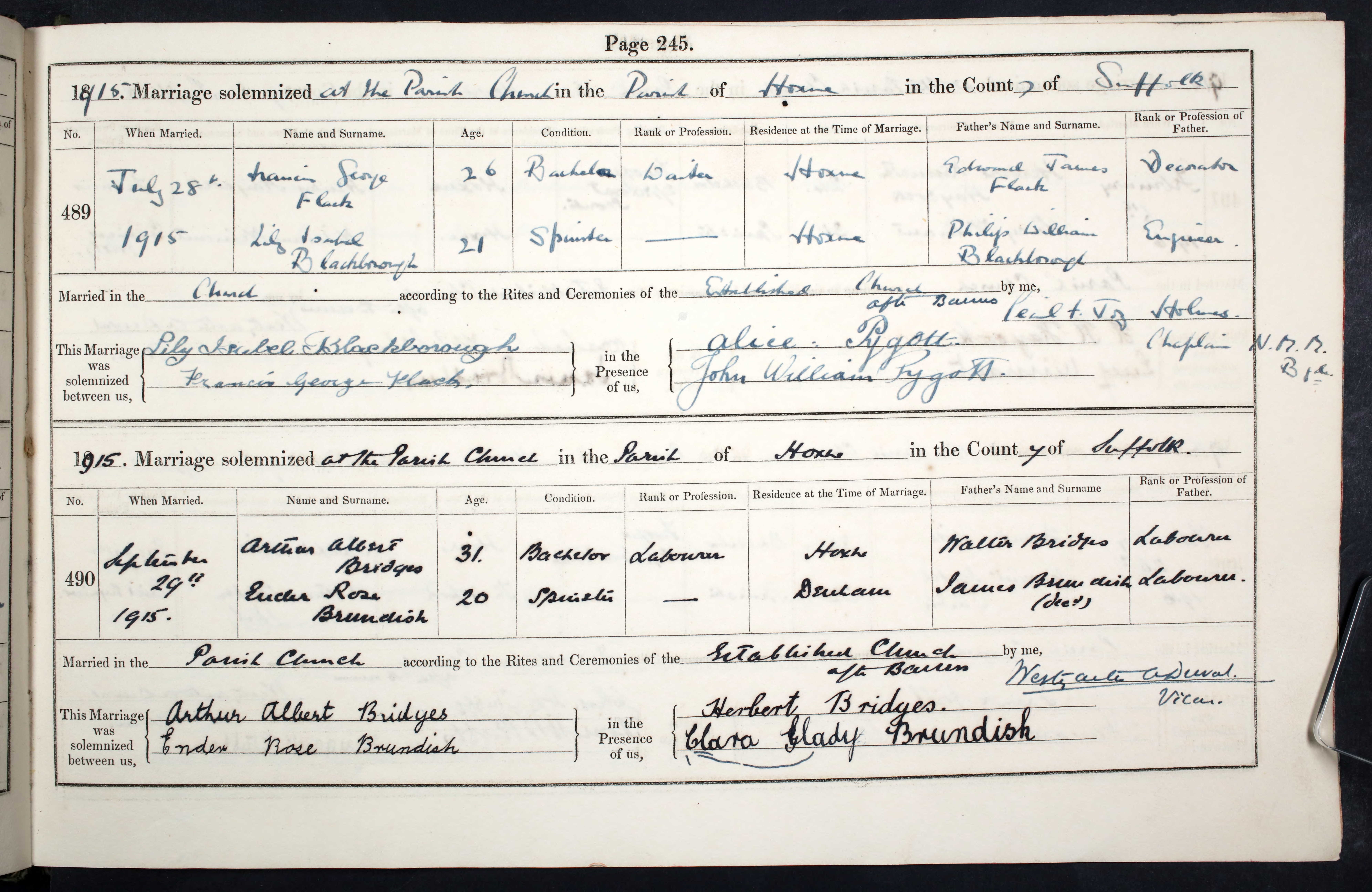 Parish Registers of St. Peter & St. Paul with St. Edmund, Hoxne, Suffolk; Marriage entry for Francis George Flack and Lily Isabel Blackborough, 28 Jul 1915, Page 245, No 489.