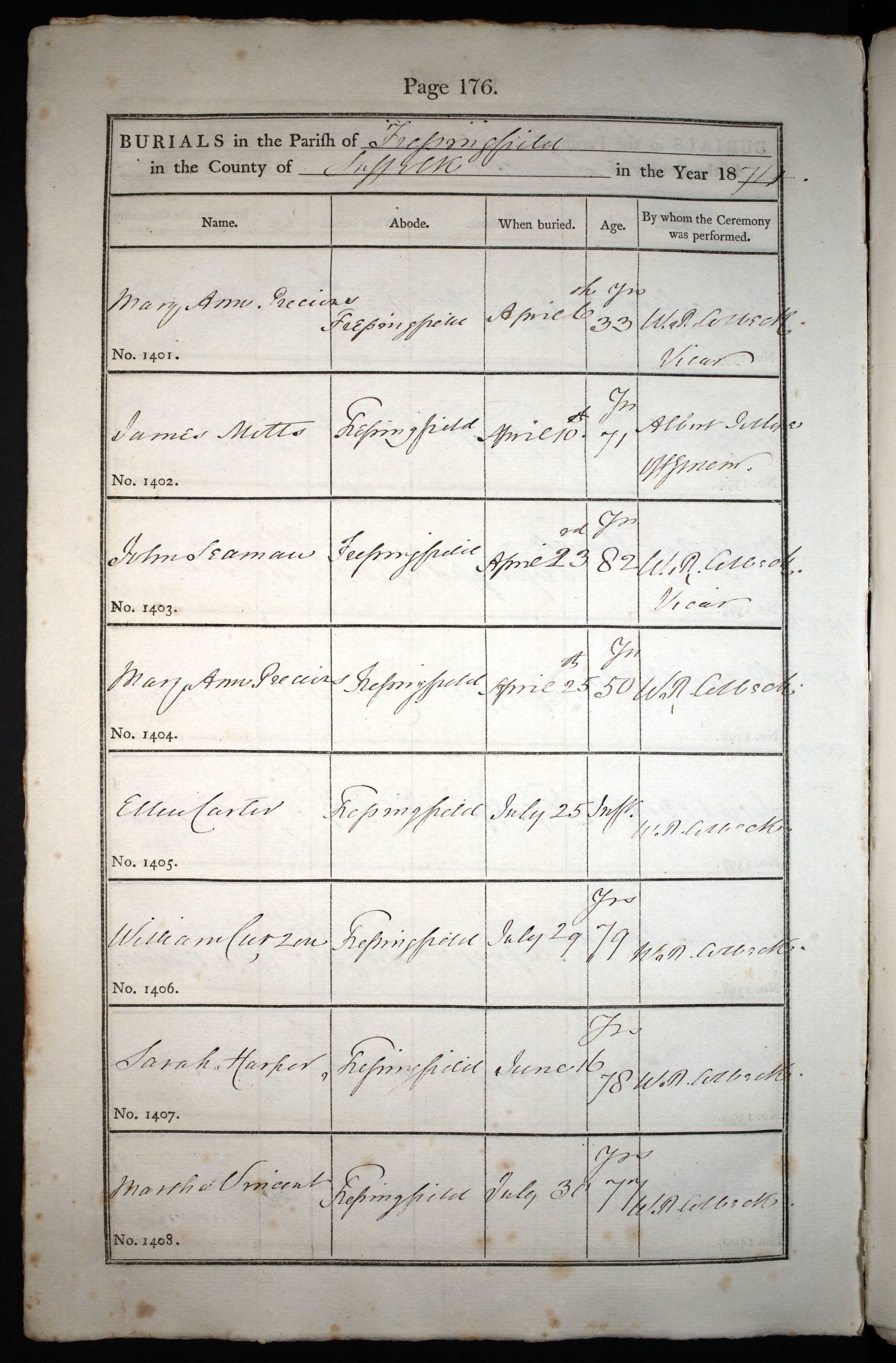 Parish Registers of St Peter & St Paul, Fressingfield, Suffolk; Burial entry for Martha Vincent, 30 Jul 1874, Page 176, No 1408.