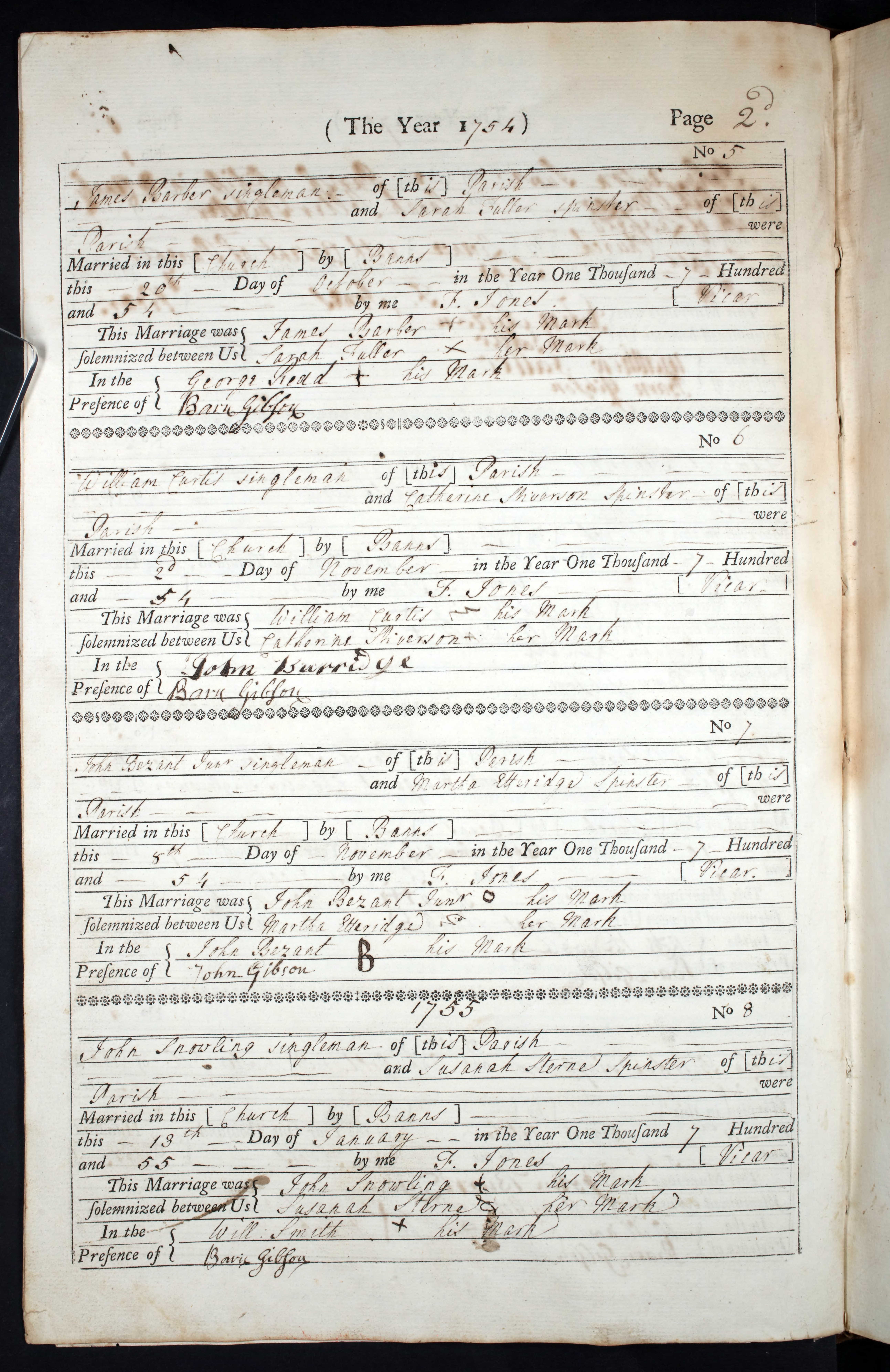 John Snowling, Bachelor, abode This Parish and Susanah Sterne, Spinster, abode This Parish. Married by Banns. Groom could not sign name. Bride could not sign name. Witness: Will Smith (could not sign). Witness: Barn Gibson (signed).