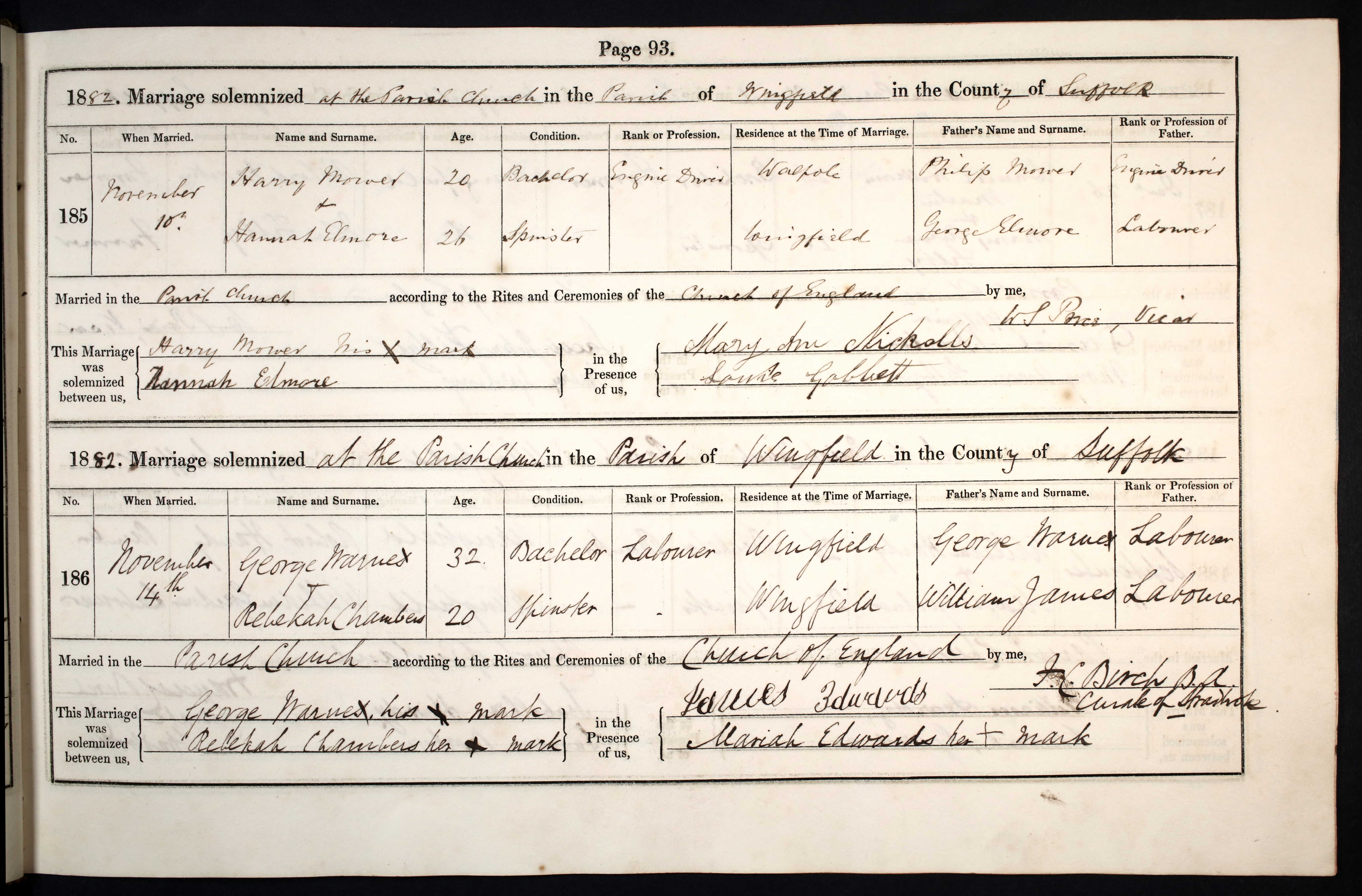Parish Registers of St. Andrew, Wingfield, Suffolk; Marriage entry for George Warne and Rebekah Chambers, 14 Nov 1882, Page 93, No 186.