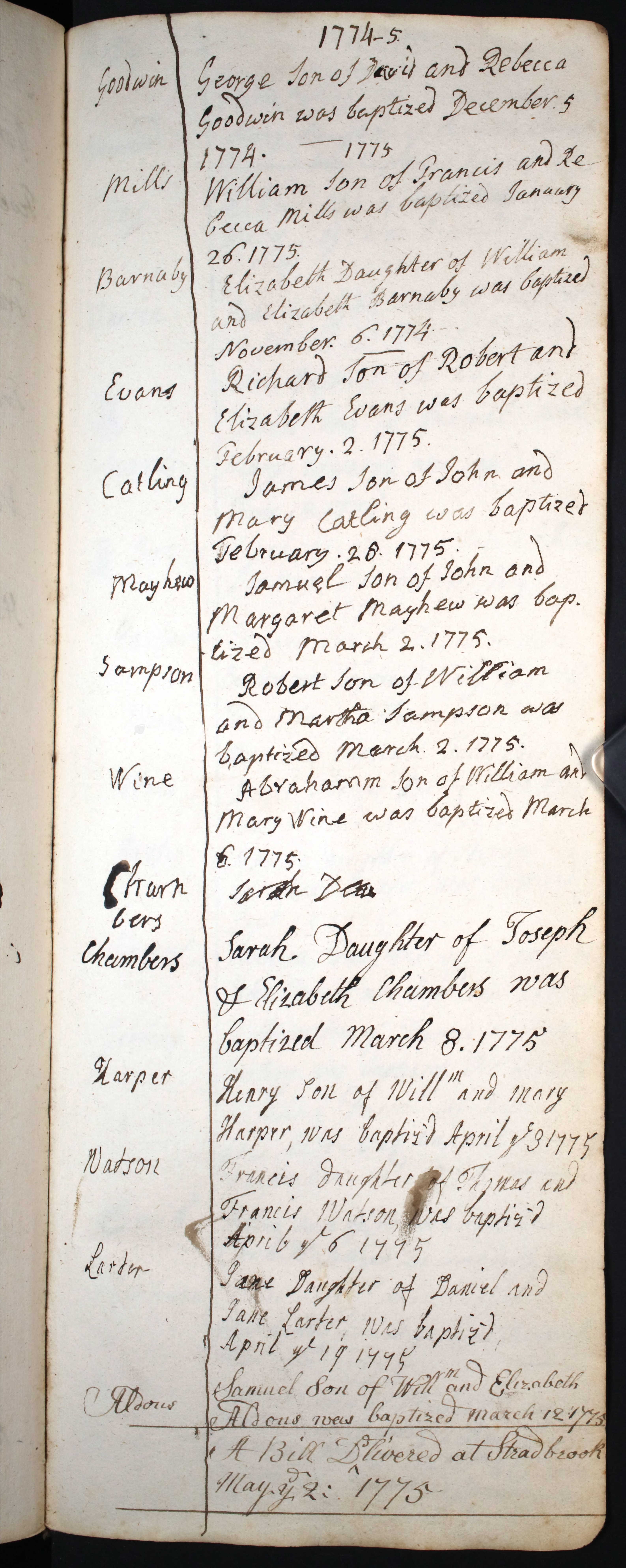 Baptism entry for Sarah Chambers, 8 Mar 1775