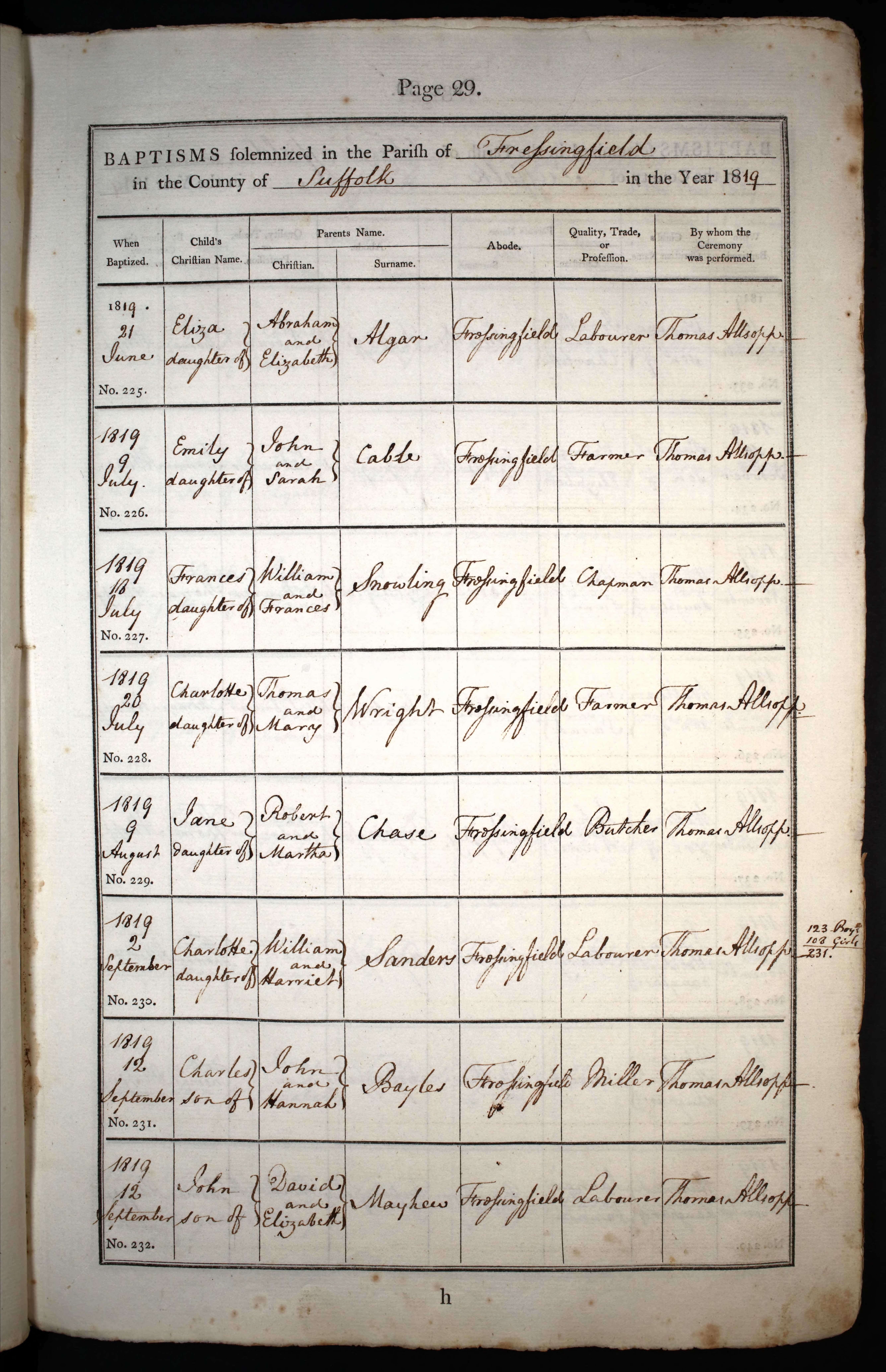 Parish Registers of St Peter & St Paul, Fressingfield, Suffolk; Baptism entry for Frances Snowling, 18 Jul 1819, Page 29, No 227.