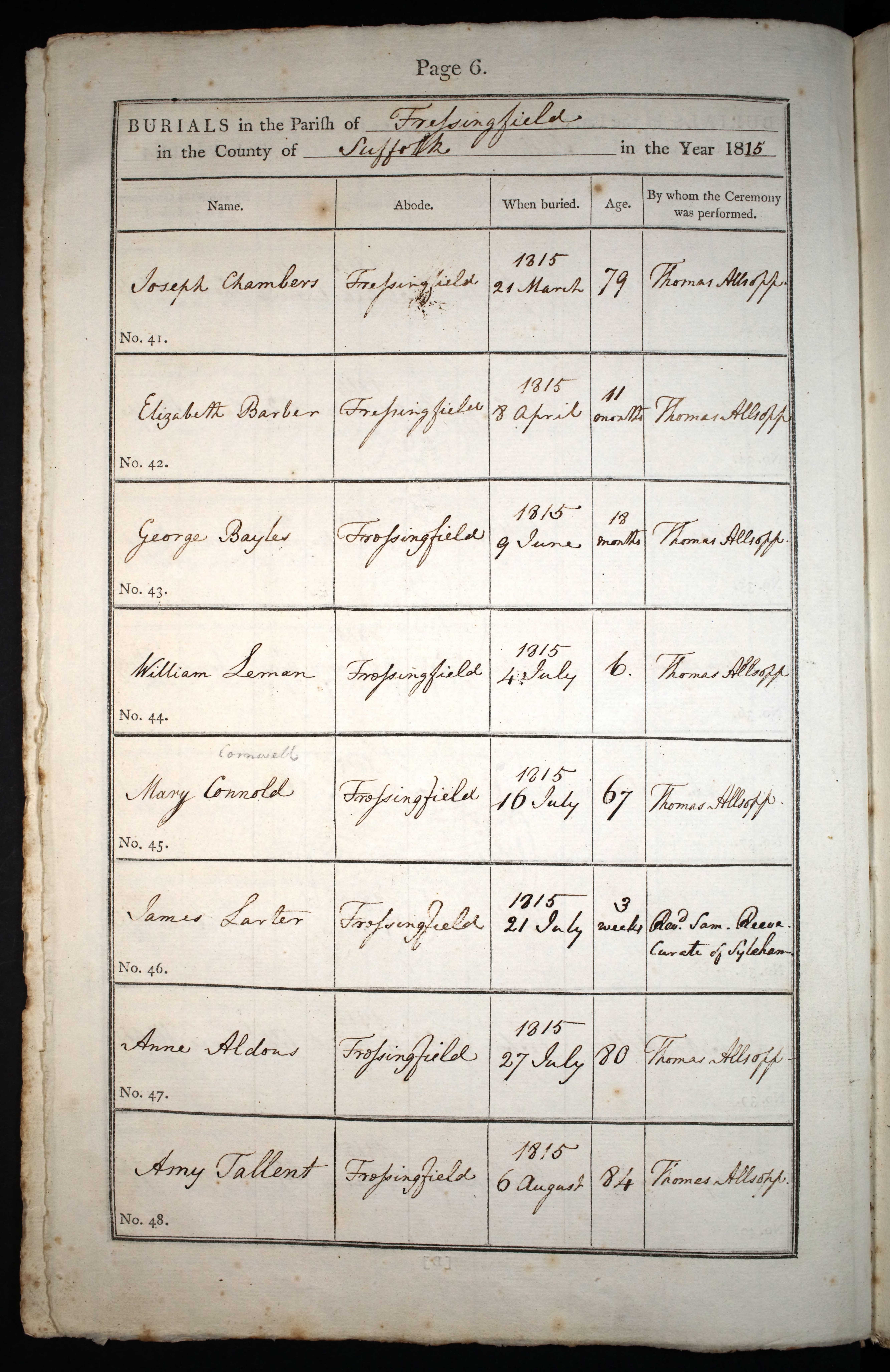 Parish Registers of St Peter & St Paul, Fressingfield, Suffolk; Burial entry for Joseph Chambers, 21 Mar 1815, Page 6, No 41.