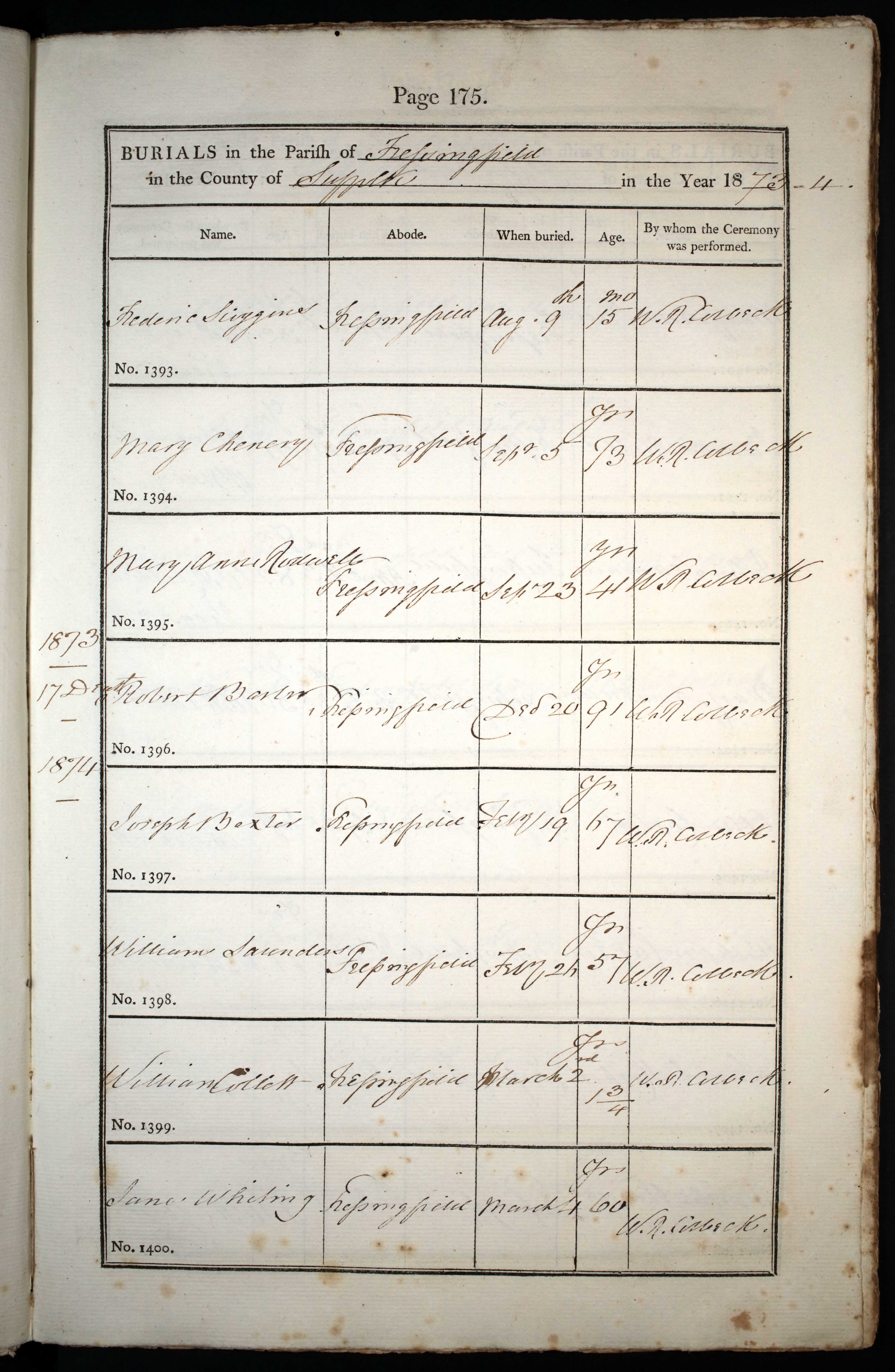 Parish Registers of St Peter & St Paul, Fressingfield, Suffolk; Burial entry for Mary Chenery, 5 Sep 1873, Page 175, No 1394.