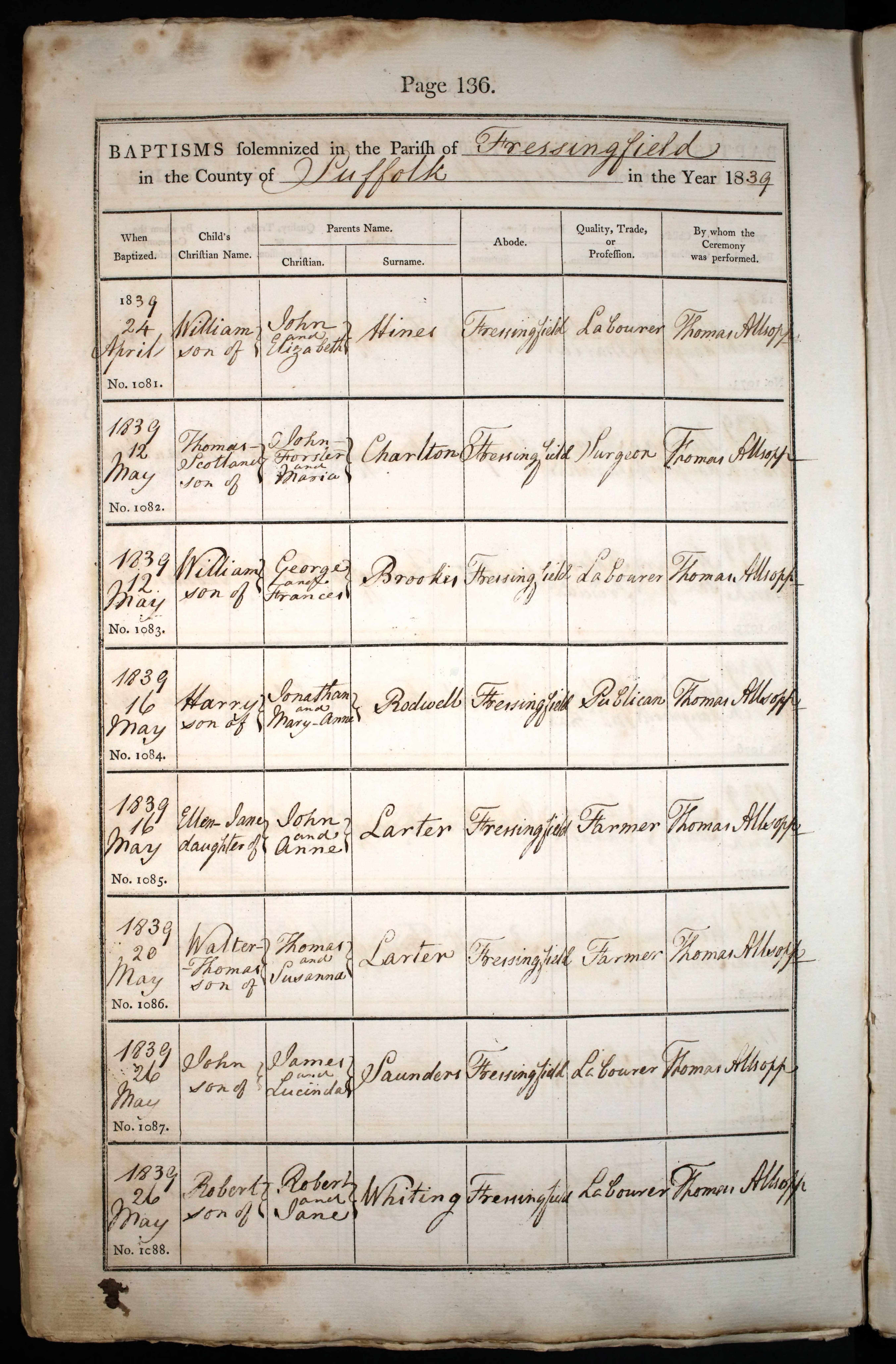 Parish Registers of St Peter & St Paul, Fressingfield, Suffolk; Baptism entry for William Brookes, 12 May 1839, Page 136, No. 1083.